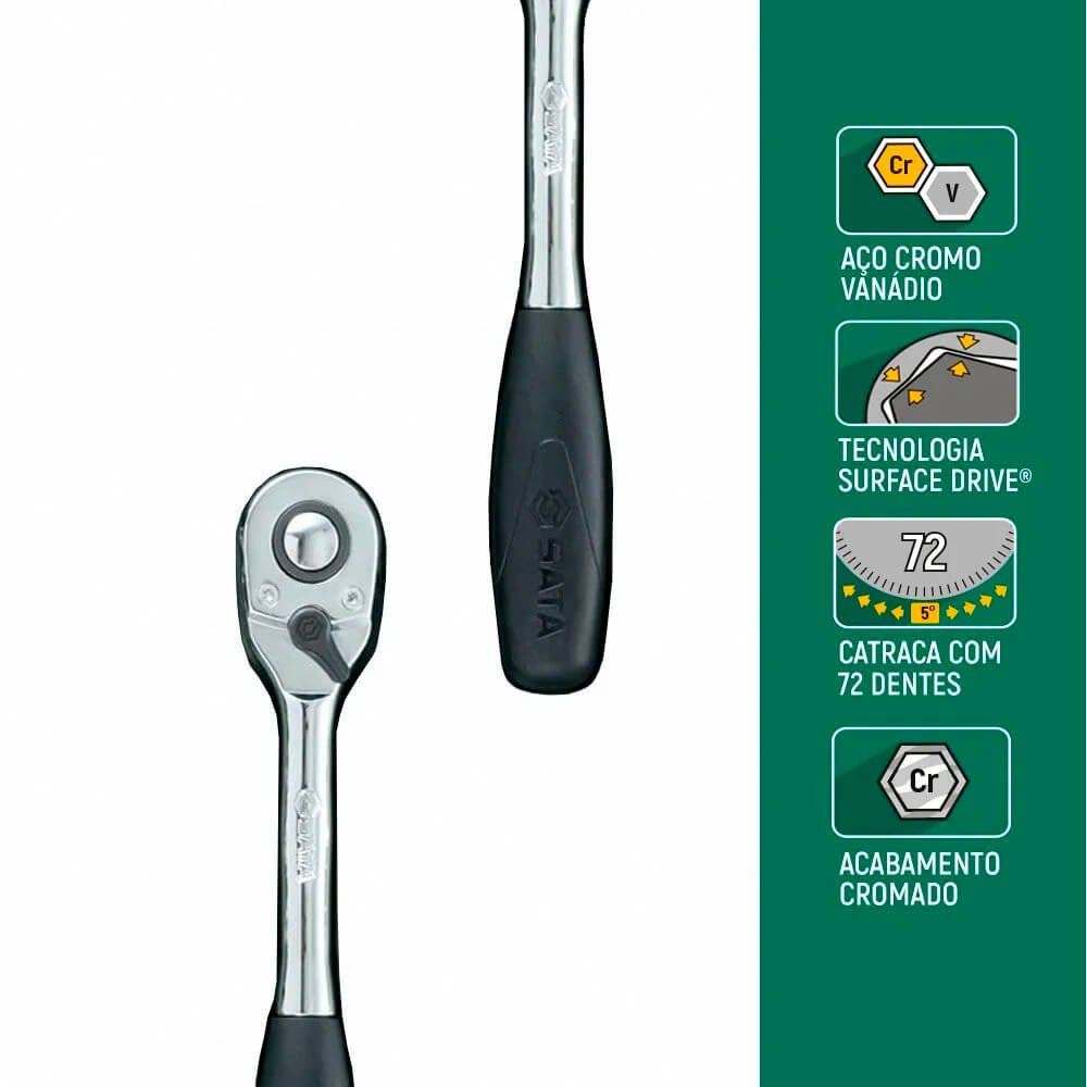 O Jogo de Soquetes Sextavados com Encaixe de 1/2 polegadas + Acessórios SATA-ST09007SJ, com 58 peças, é a escolha perfeita para profissionais que buscam qualidade superior e uma seleção abrangente de ferramentas e acessórios. Este conjunto inclui uma catraca reversível de 72 dentes com desengate rápido e arco de aperto de 5°, permitindo apertos mais precisos e eficientes. Além disso, conta com uma junta universal que possibilita alcançar parafusos de difícil acesso e dois soquetes para vela, garantindo versatilidade em suas tarefas.