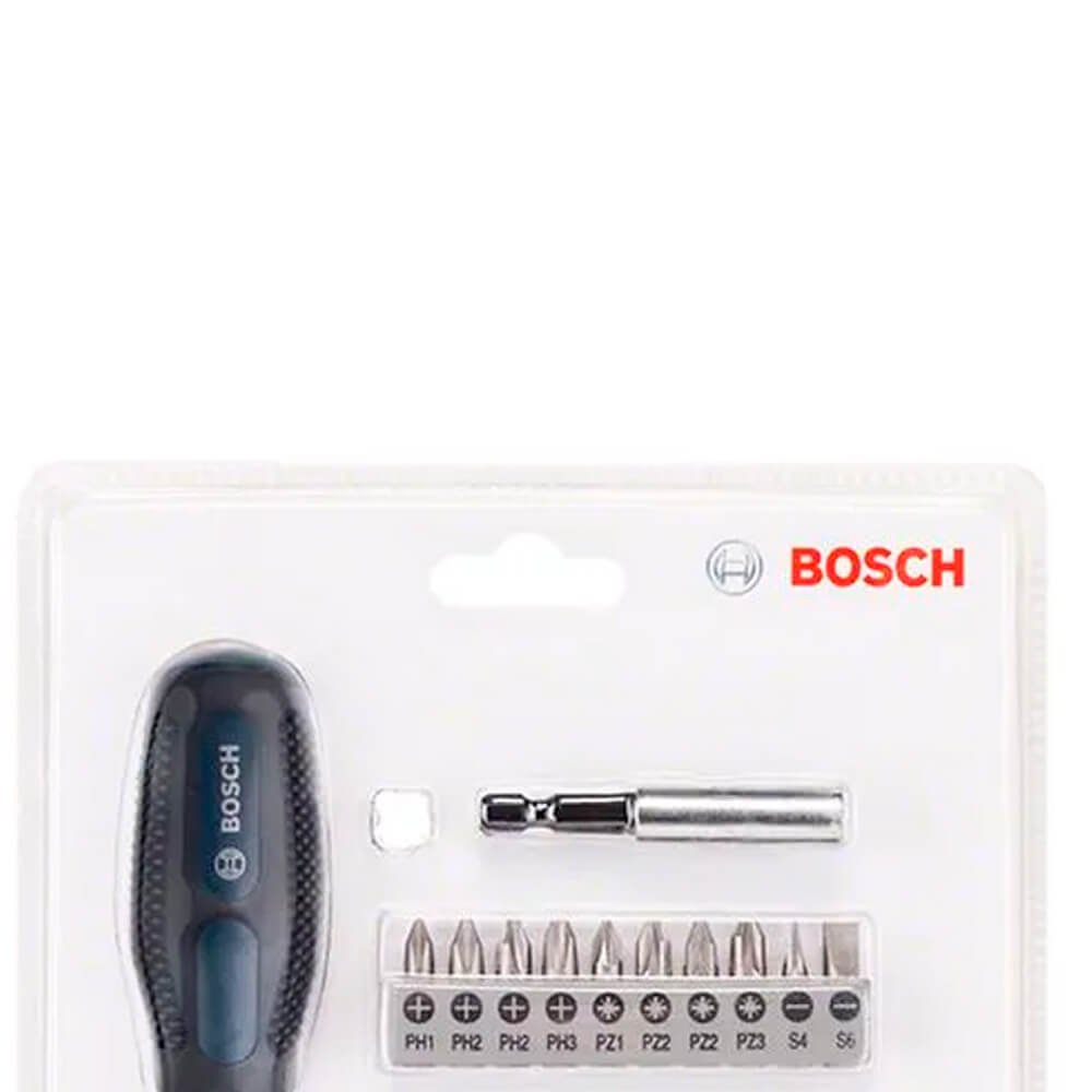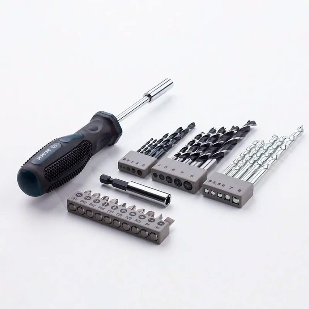 - Diferenciais Técnicos: O Kit de Pontas e Brocas Bosch é um produto completo e ideal para quem busca praticidade para executar diferentes tipos de trabalho. O Kit inclui uma variedade de pontas e brocas, além de diversos acessórios que auxiliam em aplicações de parafusamento, perfuração e fixação. O design das Pontas foi desenvolvido para evitar o desgaste da cabeça dos parafusos trazendo maior firmeza durante as aplicações, e possuem o encaixe em formato hexagonal que evita o deslizamento na ferramenta. São acompanhadas também por um adaptador magnético que possibilita trocas rápidas e a fixação segura das pontas. O Kit possui um variado portfólio de brocas com diferentes diâmetros, sendo as de aço rápido para aplicações em metal, brocas com ponta de metal duro para perfurações em alvenaria e brocas de três pontas para aplicações em diferentes tipos de madeira. Com sua ampla variedade de acessórios, o Kit pode ser utilizado em diversas aplicações desde reparos, instalações e montagens, até pequenos trabalhos em obras, serralherias e marcenarias, além de acompanhar uma maleta robusta que facilita a armazenagem, transporte e acesso de todo o conteúdo de forma bastante organizada.