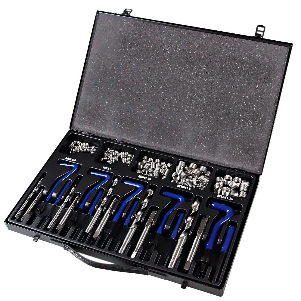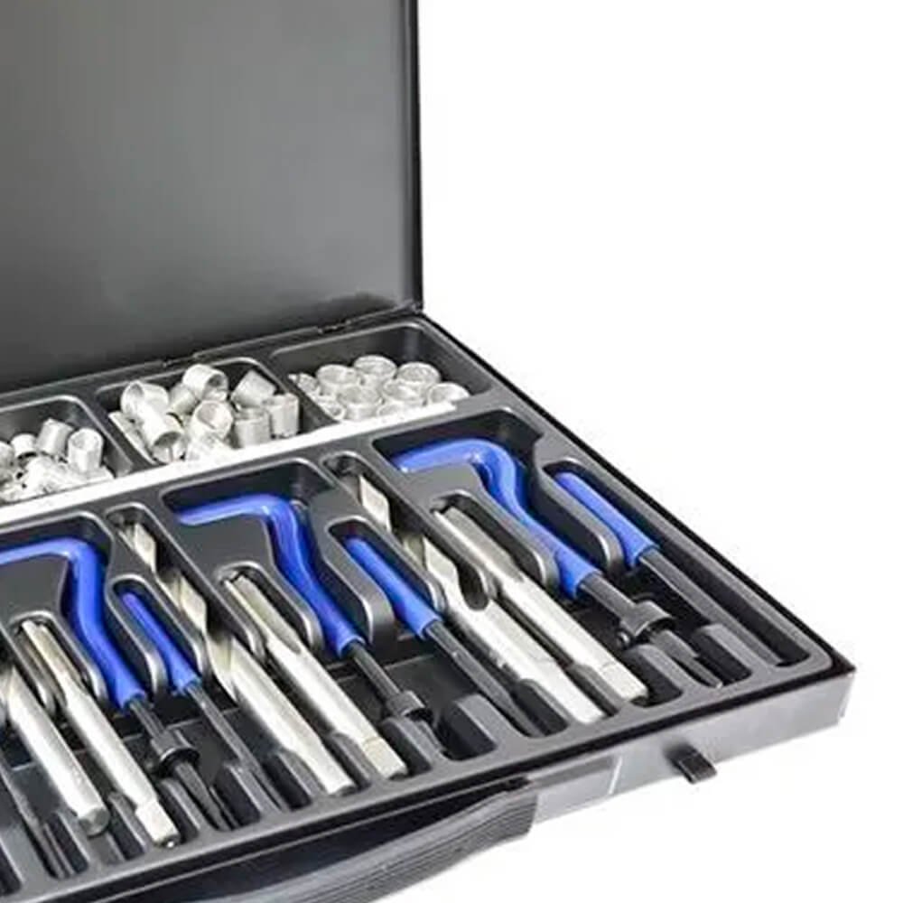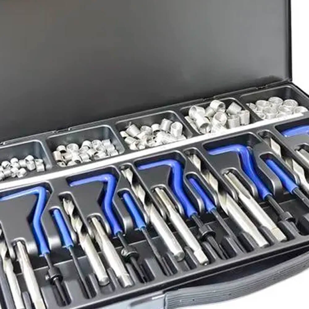 Kit para reparo de roscas; Reparo rápido e permanente; Recupera o padrão original, permitindo o uso do mesmo parafuso; Peças acomodadas em berço plástico; Acompanha estojo metálico;
