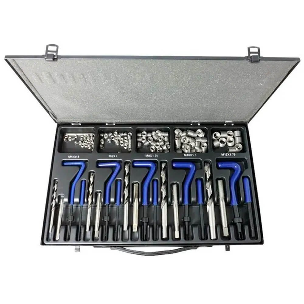Composto por: 110 Roscas postiças de aço inox; 05 Brocas HSS; 05 Machos HSS; 05 Punção; 05 Guia; 01 Chave hexagonal.