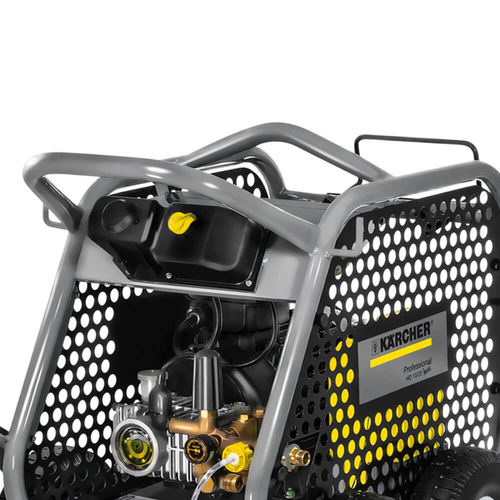A lavadora de alta pressão profissional HD 10/25 Cage dispõe de uma vazão de 1000 l/h e pressão de até 250 bar. Apresenta bomba de virabrequim, cabeçotes e bielas de latão e pistões de cerâmica de alta performance dimensionada para uso diário e continuo, com alto rendimento, resistência e baixo desgaste. Com visor frontal de nível e qualidade de óleo. Sistema de sucção com baixa perda e conjunto de vedações de alta performance. Válvula Multifuncional: integra by pass, stop total, sucção de detergente, regulagem de pressão e vazão em um único componente.