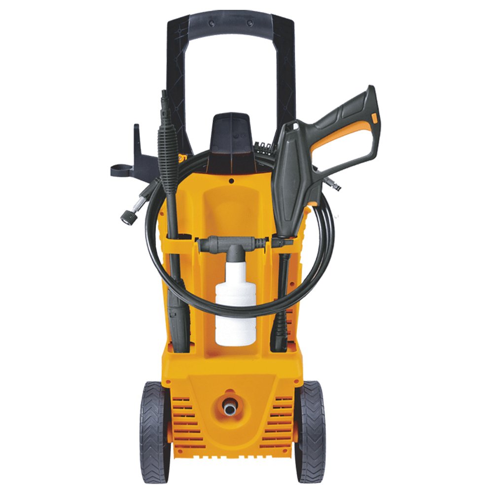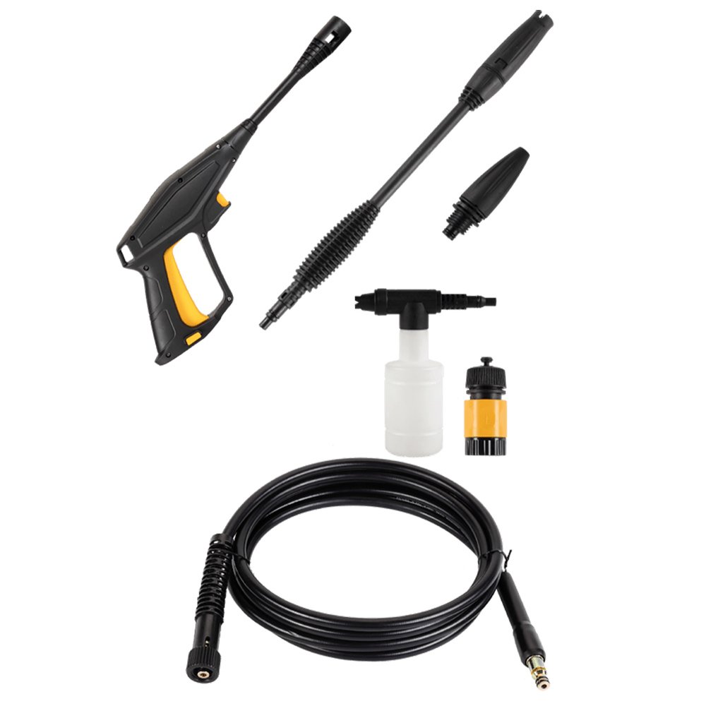 | Acessórios | 1 Pistola de alta pressão com trava de segurança; 1 Bico regulável (leque e concentrado); 1 Bico turbo; 1 Mangueira de alta pressão de 5 metros; 1 Aplicador de detergente; 1 Engate rápido; 1 Agulha de limpeza do bico. |