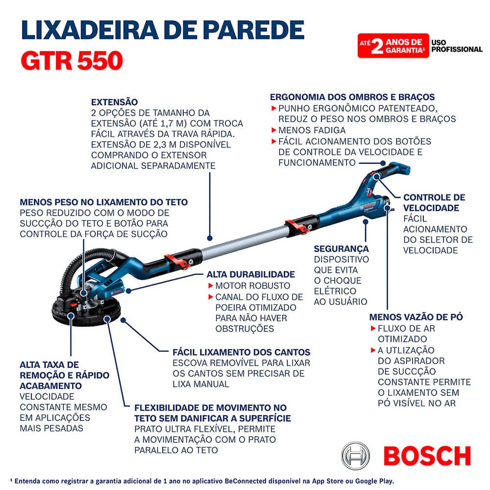A lixadeira de parede GTR 550 Bosch é a parceira confiável para profissionais que executam trabalhos desafiadores. A lixadeira de parede da Bosch tem a Cabeça Ultra Flexível patenteada que permite o movimento sem esforço em tetos e paredes, sem danificar à superfície. O prato flexível não danifica a superfície de lixamento do teto e o seu fluxo de ar otimiza a sucção fazendo menos sujeira.