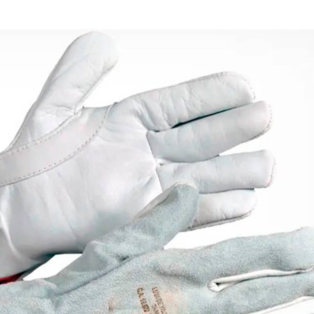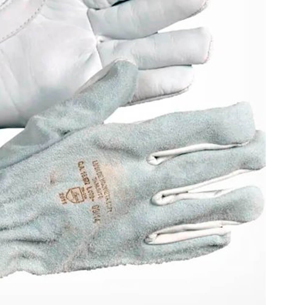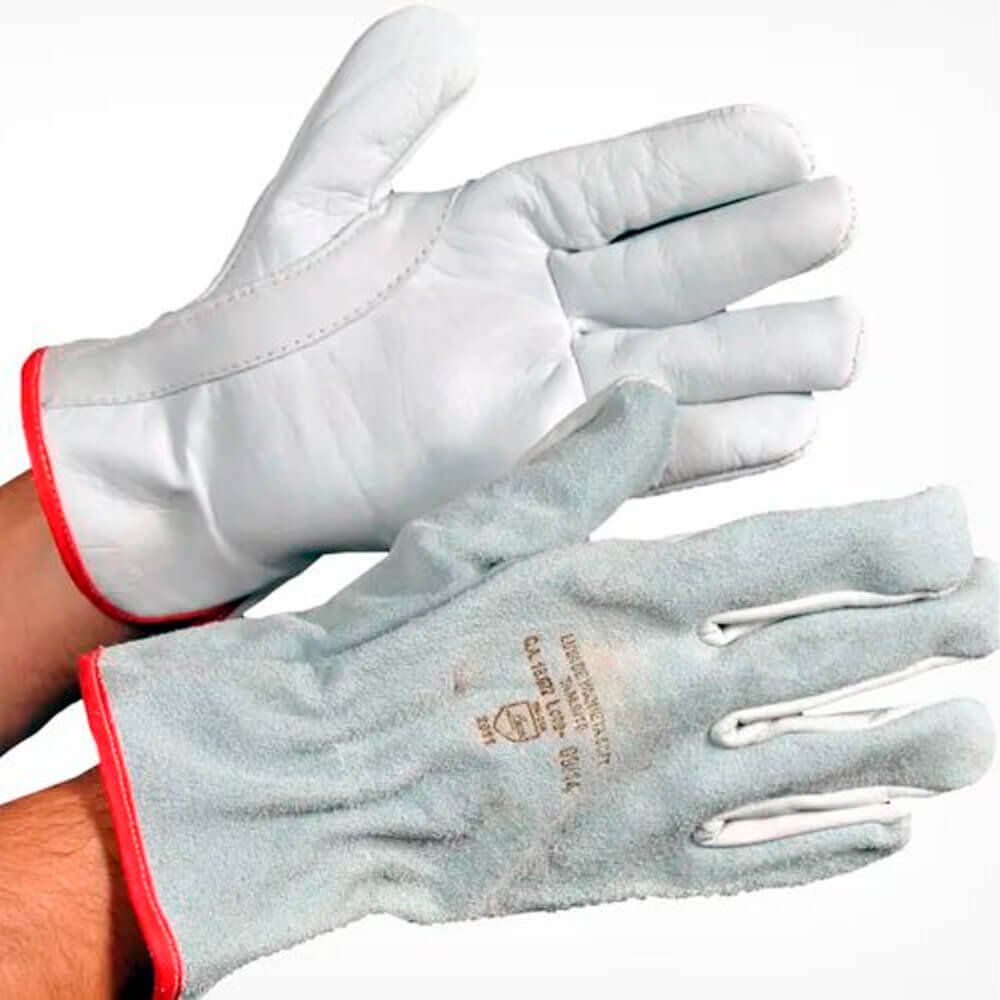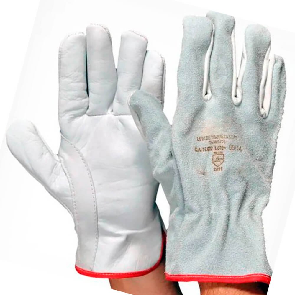 Luva de Vaqueta Mista, também conhecida como Luva de Vaqueta Mista Tipo Petroleira, confeccionada em Vaqueta na palma e dorso em Raspa, ambos couro bovino curtido ao cromo, com reforço entre o polegar e o indicador, com ou sem reforço palmar interno, tipo petroleira, com elástico embutido no dorso, acabamento em viés vermelho, costurada com linha de nylon, com espessura em média 1,20 mm e gramatura 0,057 gramas/cm² ou 0,57 kg/m². (Pode haver variação de +- 5 mm); Modelo: Palma em vaqueta, dorso em raspa, com reforço interno na palma;