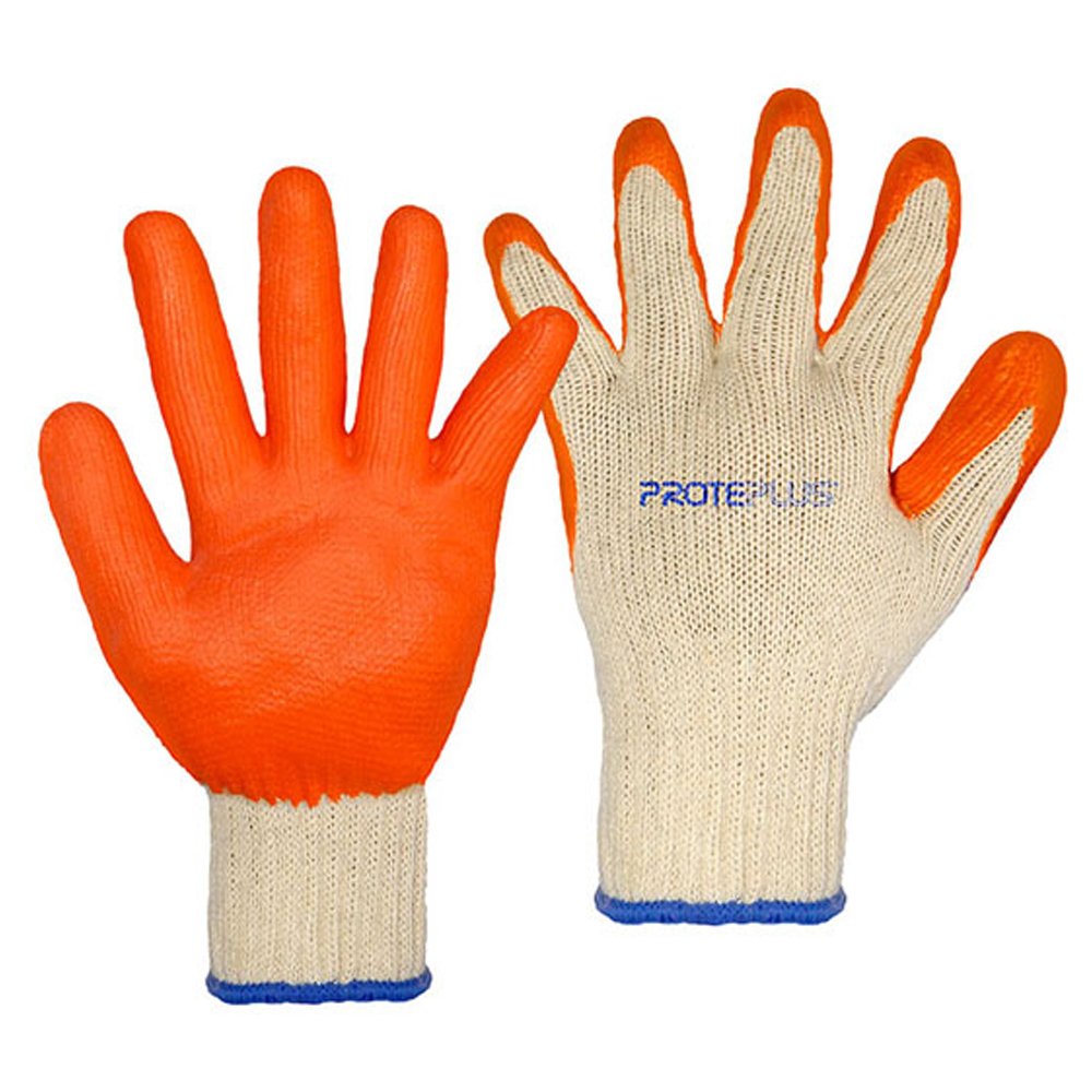 Luva de segurança confeccionada em malha de quatro fios de algodão. Pigmentos com aplique em látex espalmado nas palmas, dedos e pontas dos dedos na cor laranja. Punho com acabamento em elastano e costura em overloque.