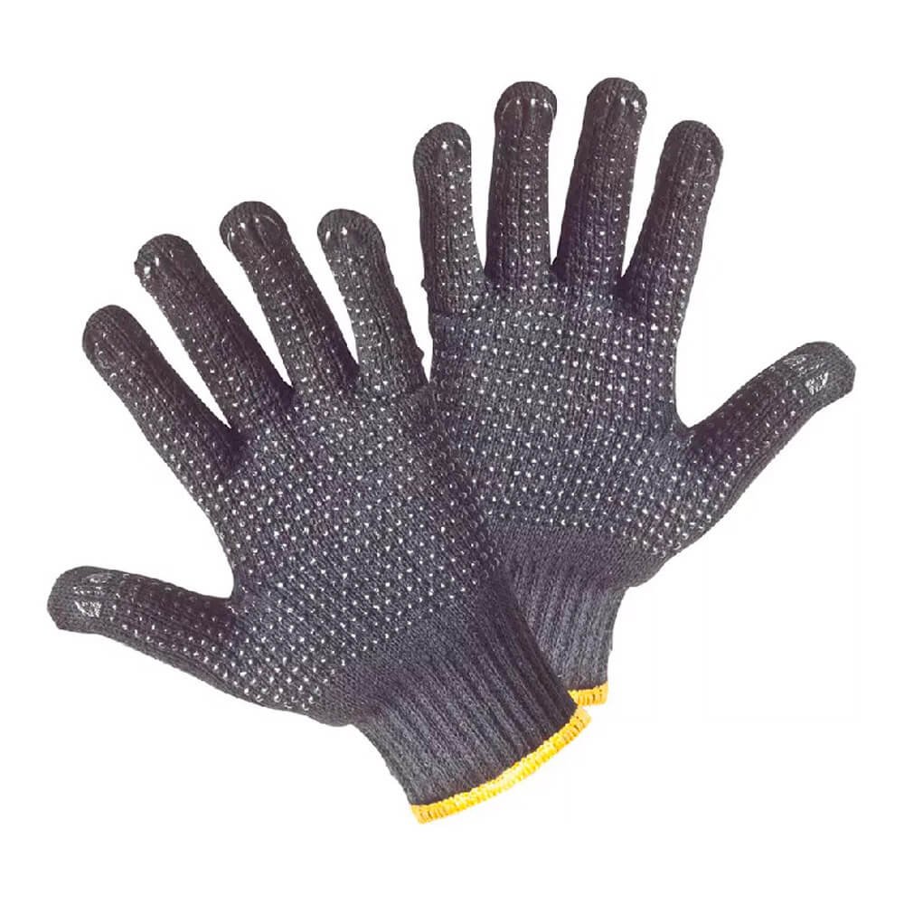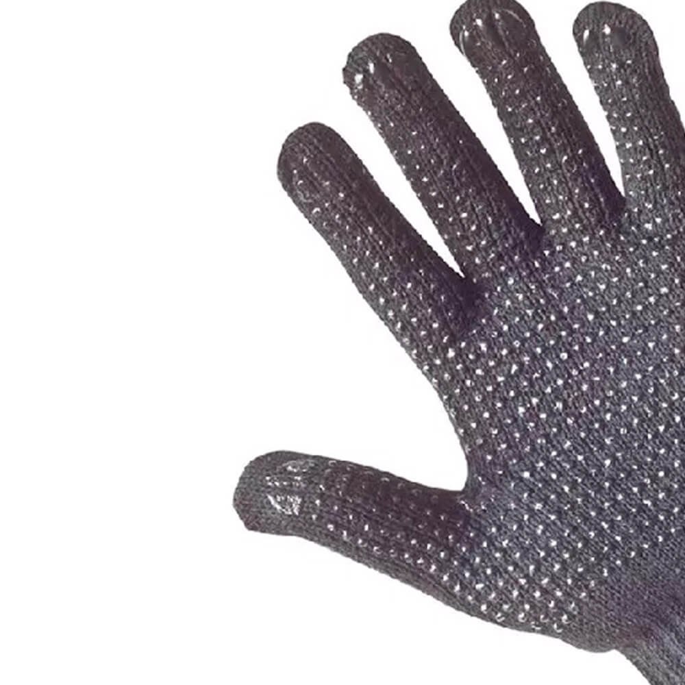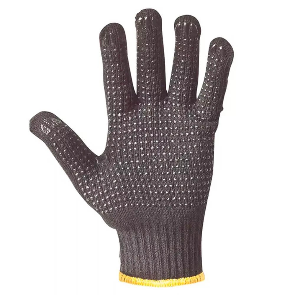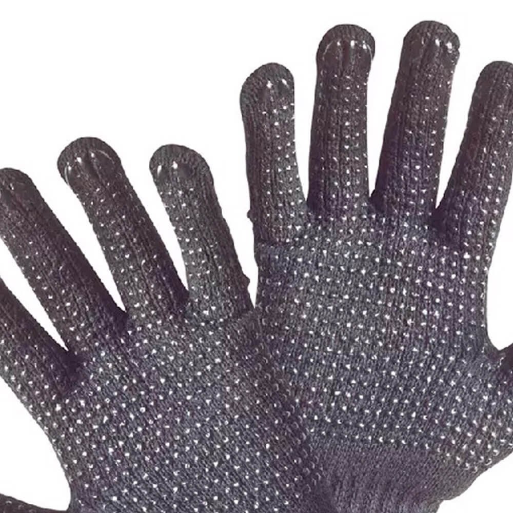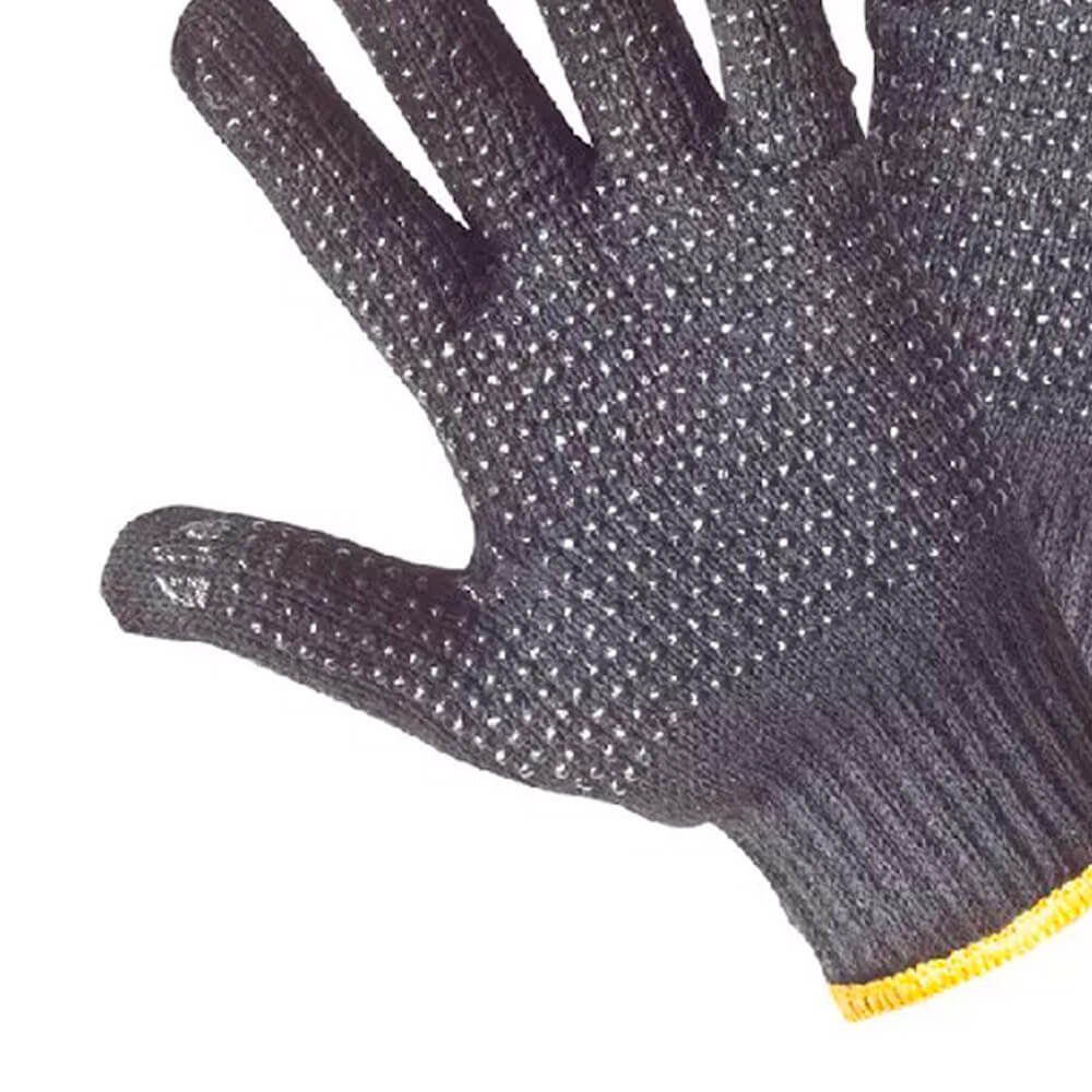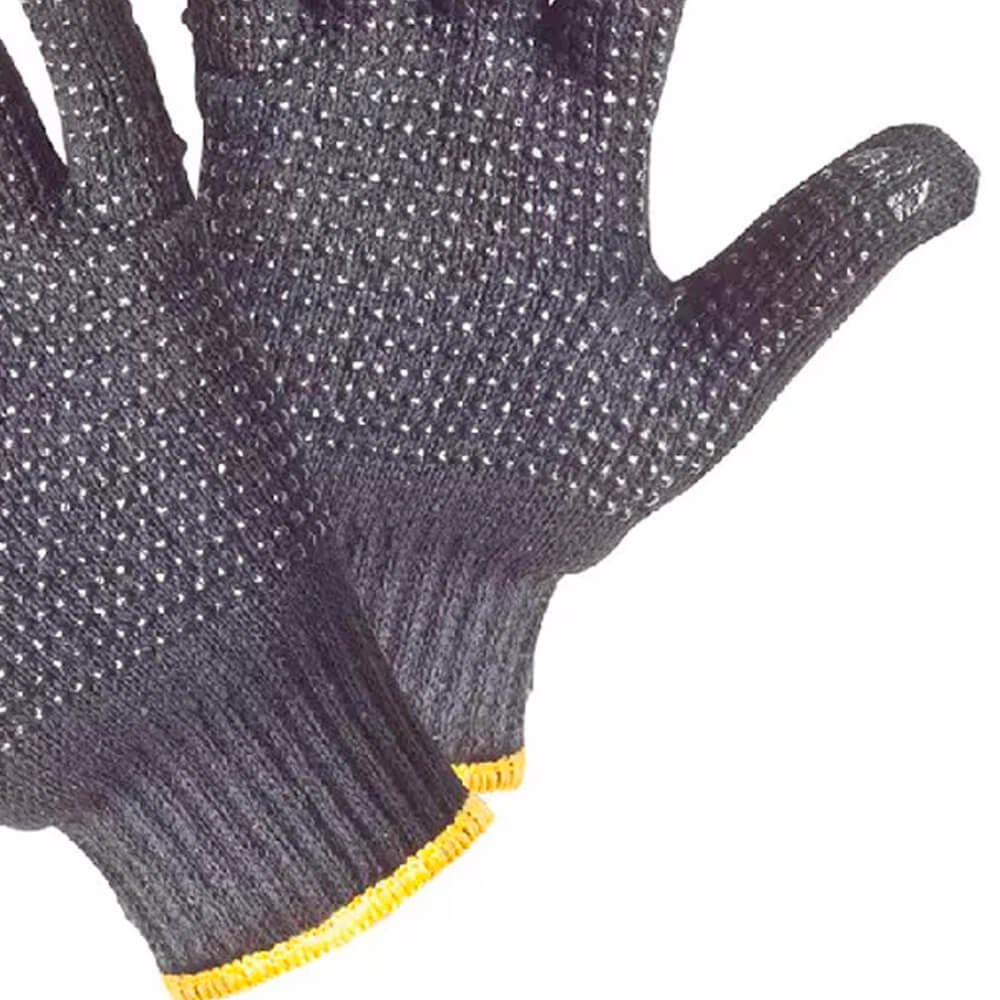 Luva de segurança confeccionada em malha de dois fios de algodão. Pigmentos em PVC nas palmas, dedos e ponta dos dedos. Punhos com acabamento em elastano e costura em overloque.