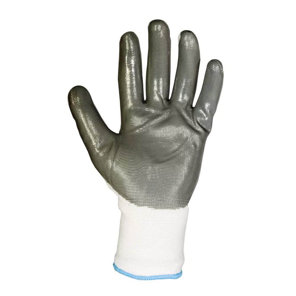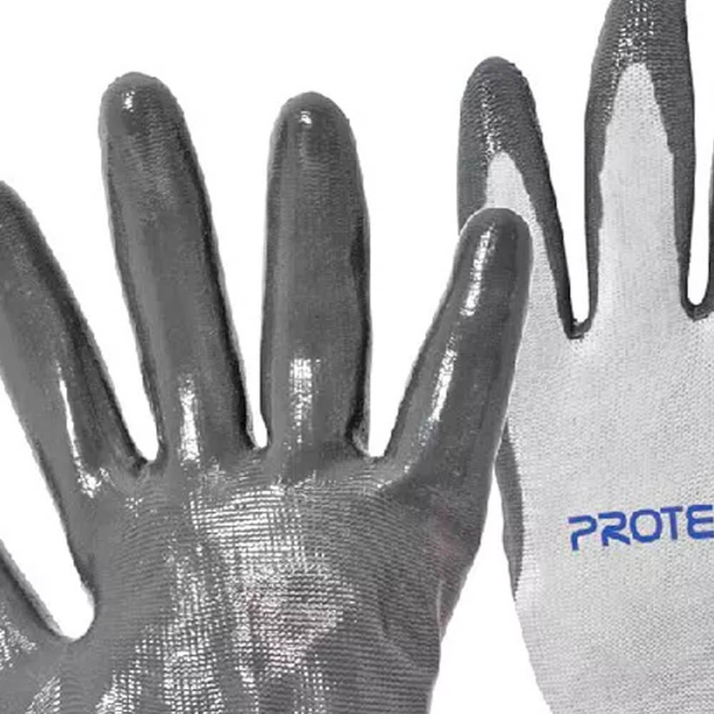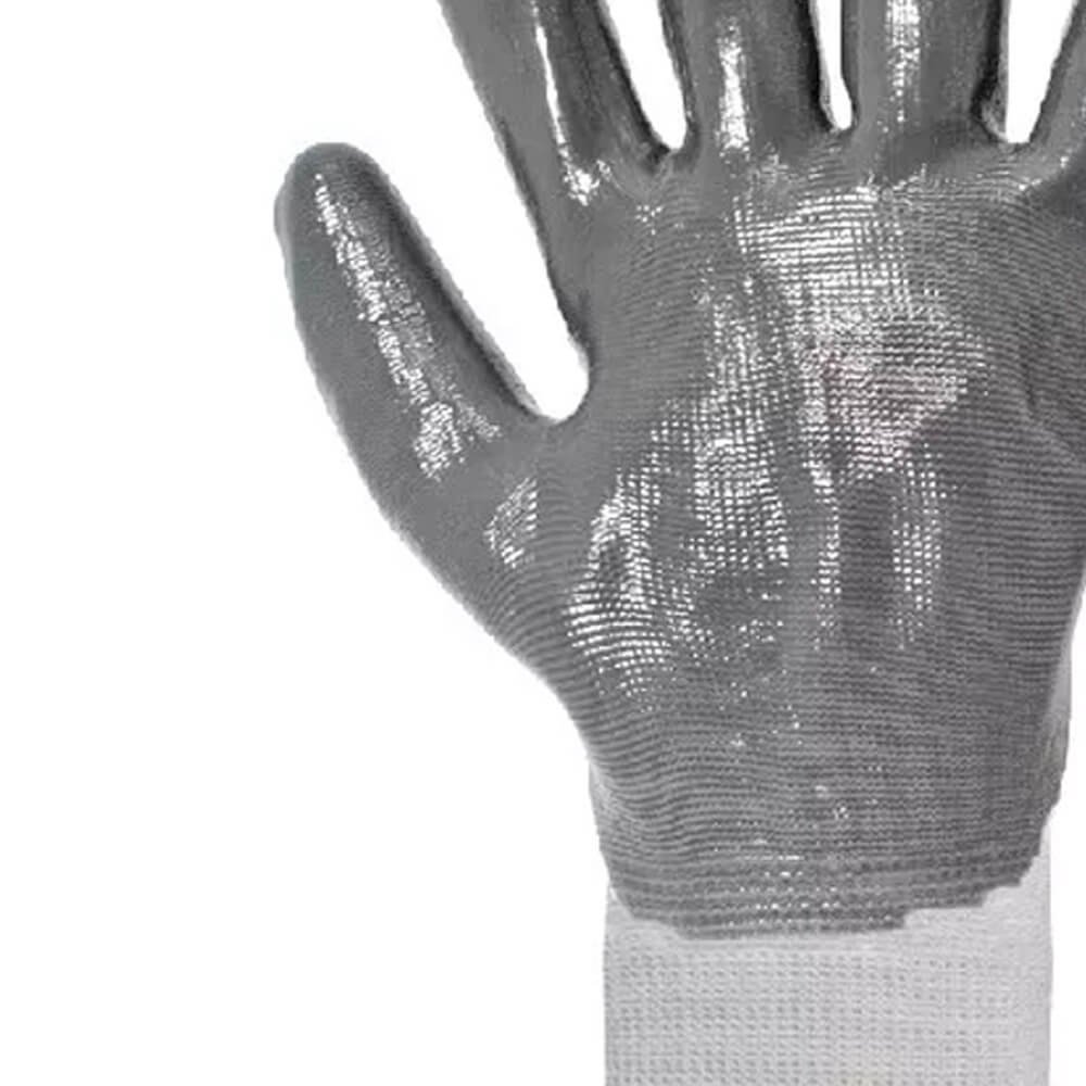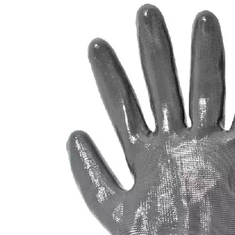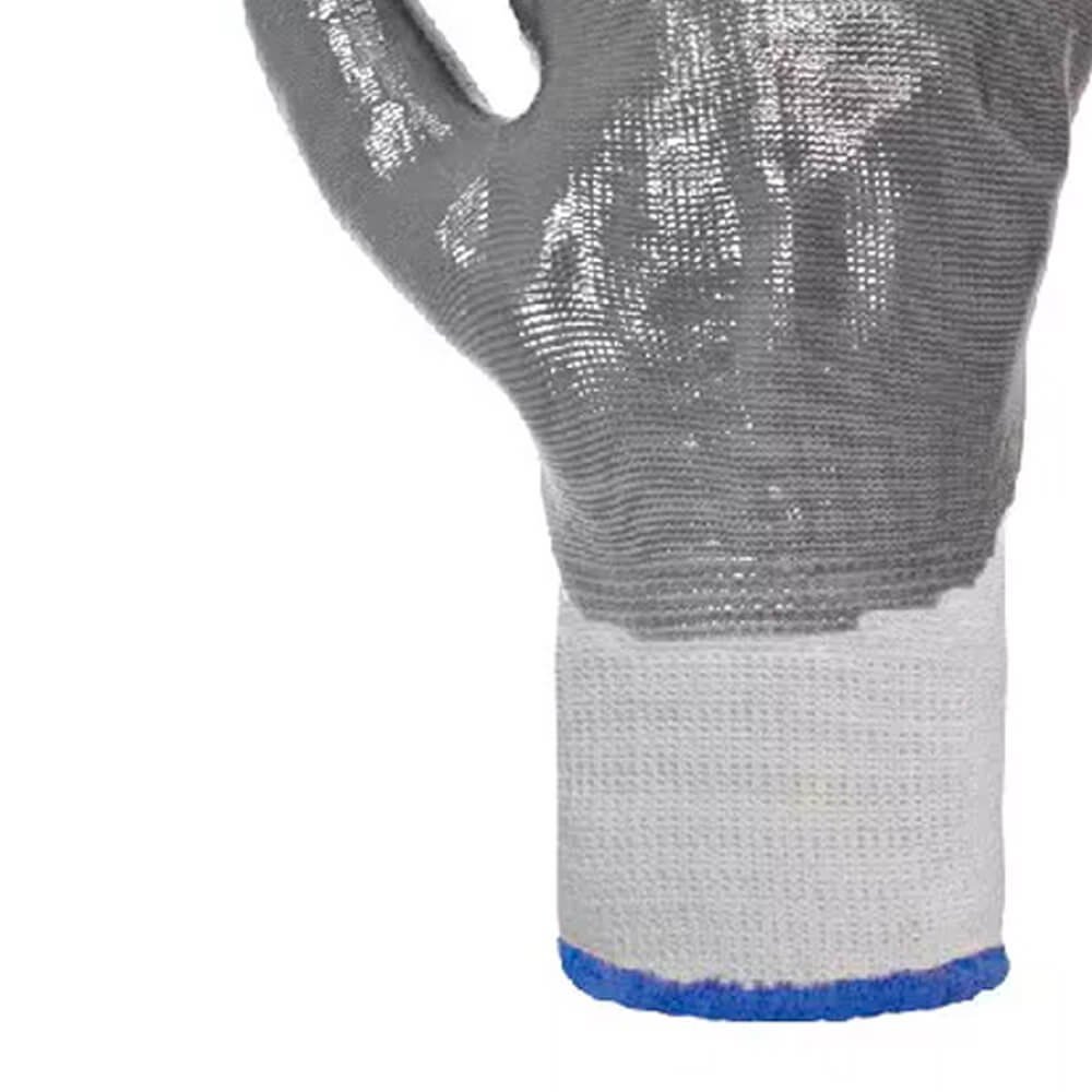 Luva de segurança confeccionada em malha de poliéster. Pigmentos com aplique em borracha nitrílica nas palmas, dedos e pontas dos dedos na cor cinza. Punho com acabamento em elastano e costura em overloque.