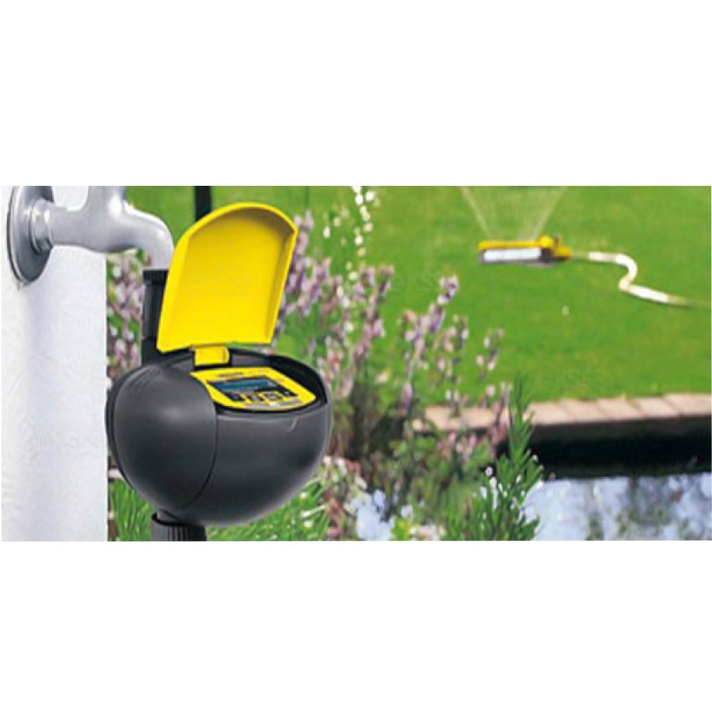 Timer automático com programação de até 72 regas de até 90 minutos cada, display em LCD, inclui pré-fi ltro e conector de torneira; Funcionamento com bateria de 9V (não incluída), pode ser conectado ao sensor de chuva; Para regar pequenas a grandes áreas e jardins, verduras e plantas em vasos ou jardins, plantas ornamentais em vasos ou jardins.