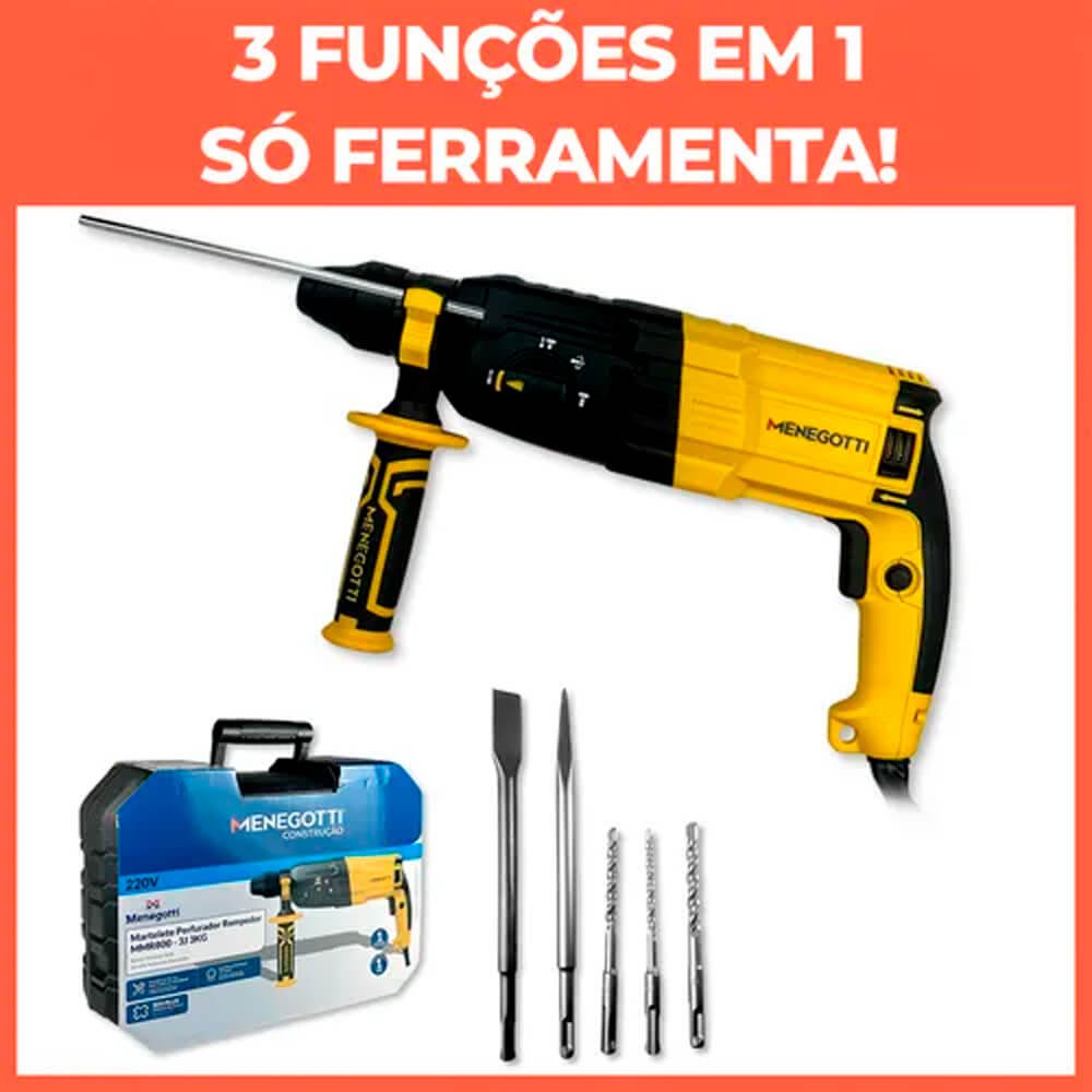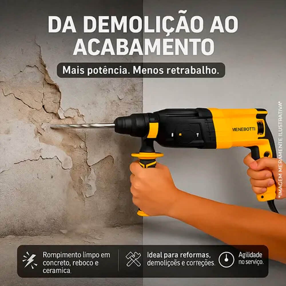 O Martelo Rompedor Menegotti MMR800 é projetado para demolições controladas e perfurações pesadas em concreto, alvenaria e outros materiais resistentes. Com motor de 800W e energia de impacto de 3 Joules, oferece potência e eficiência para uso em obras, reformas e manutenção. Sua estrutura compacta e peso de 3 kg permitem melhor controle, reduzindo a fadiga do operador em longos períodos de trabalho. Equipado com um punho emborrachado, oferece maior controle e conforto durante o uso. A alça auxiliar garante firmeza e estabilidade nas operações, enquanto a trava no gatilho permite um trabalho contínuo sem interrupções. Além disso, o martelete perfurador conta com um sistema de perfuração eficaz, proporcionando um desempenho superior para perfurações em diversos materiais, tornando-o uma excelente escolha para profissionais que exigem alta potência e durabilidade em suas ferramentas.