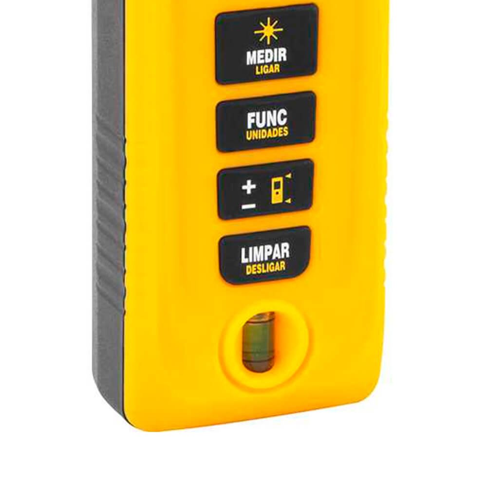Indicado para ambientes internos e externos. Realiza medições de distância, contínua (trena eletrônica), área, volume, indireta (Pitágoras simples e Pitágoras com adição), medição de máximo e mínimo, adição e subtração. Permite a realização de medições em 5 unidades diferentes. Conta com função memória das últimas 10 medições. Duração aproximada das pilhas alcalinas: 5.000 medições. Desligamento automático do laser em aproximadamente 30 segundos e do aparelho em 180 segundos.