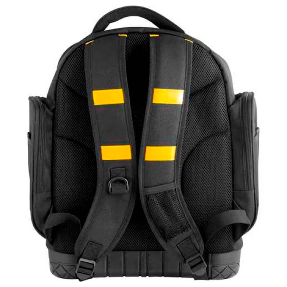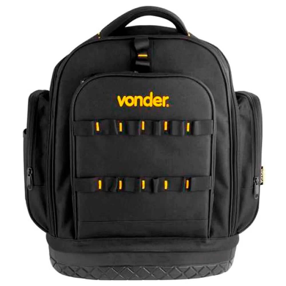 Possui alças almofadadas com costuras reforçadas para ombros, alça de mão em nylon almofadado, apoio para costas almofadado com tecido respirável, abertura total e divisões/bolsos divididos em: parte externa com 7 bolsos e 14 encaixes, parte interna com 8 bolsos.