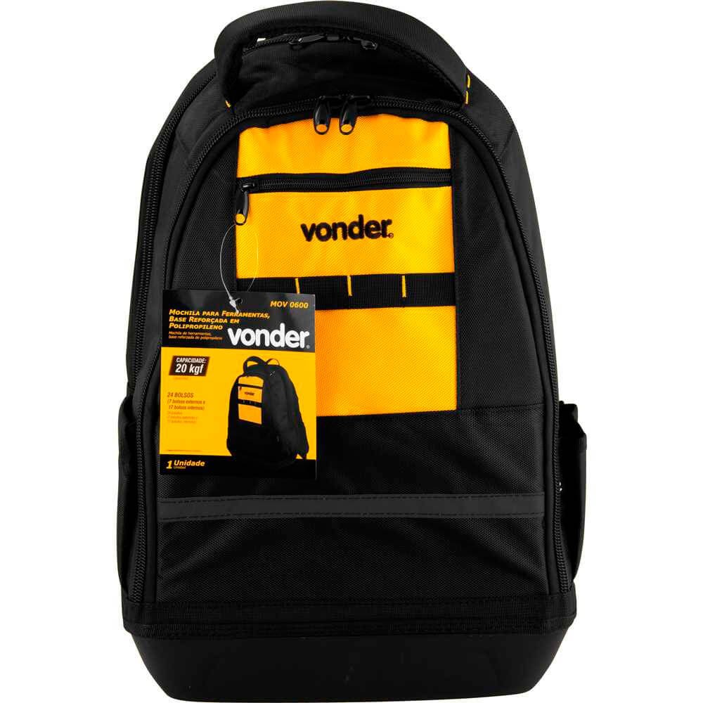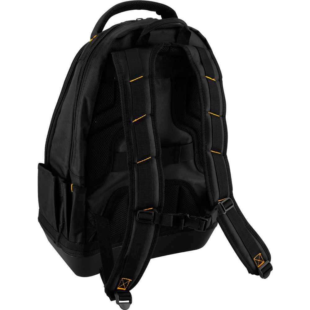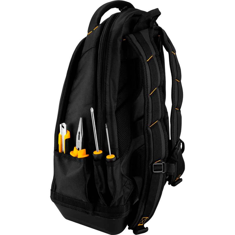 Possui alças almofadadas com costuras reforçadas, duas alças de mão (uma para movimentar a mochila e outra para pendurá-la), apoio para costas almofadado com tecido respirável, cinta peitoral ajustável e base em polipropileno, resistente a impactos e água, garantindo maior durabilidade. Conta ainda com 24 bolsos, sendo 7 bolsos externos e 17 bolsos internos, além de compartimentos para ferramentas com 11 encaixes.