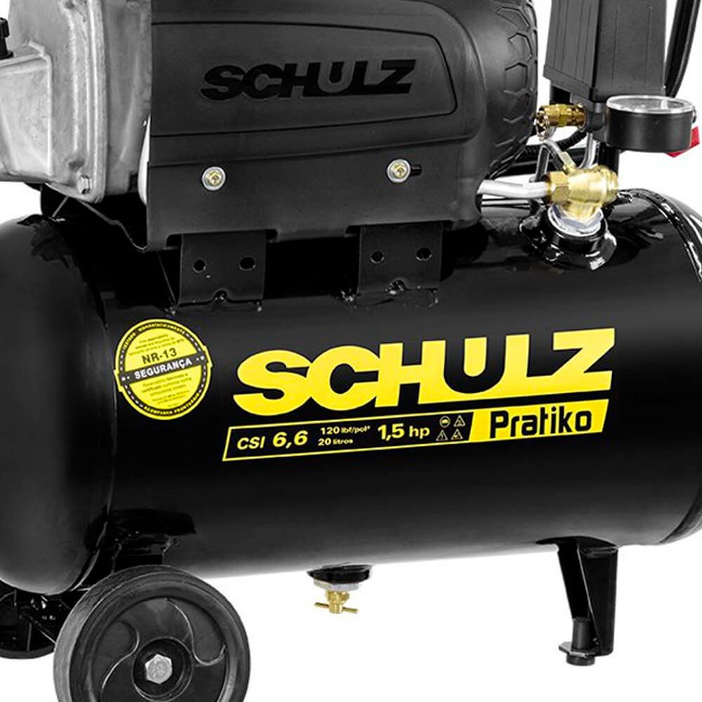 Projetado e fabricado pela Schulz no Brasil, o compressor portátil Pratiko CSI 6,6/20 oferece mais possibilidades para suas atividades profissionais. Indicado para serviços leves e pequenas manutenções, o Pratiko CSI 6,6/20 é excelente para pinturas em geral com pistola de pintura de baixa produção*, limpeza de peças e superfícies com pistola e bico de ar, acionamento de pequenas ferramentas pneumáticas, pulverização de óleo para lubrificação de máquinas e equipamentos, calibragem de pneus e enchimento de objetos infláveis, como bolas, boias, botes e colchões.