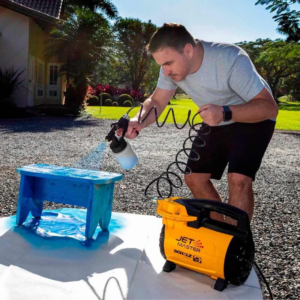 Desenvolvido e fabricado pela Schulz no Brasil com materiais e processos de última geração, o novo Jet Master torna o seu hobby ainda mais profissional. Excelente para pintar, pulverizar, limpar, inflar objetos e calibrar pneus, reúne inovação, tecnologia e benefícios únicos. Sua válvula com dupla função permite ajustar a pressão do produto conforme a necessidade e atribui maior vida útil ao equipamento, vantagem garantida também pela pintura a pó, que eleva a resistência contra corrosão. O motor Schulz com protetor térmico entrega maior durabilidade e confiabilidade. O novo Jet Master possui alça ergonômica e funcional (com patente requerida) que facilita o transporte, cobre as partes quentes do equipamento e, ainda, conduz o ar de refrigeração até a tampa.