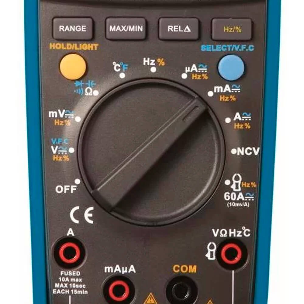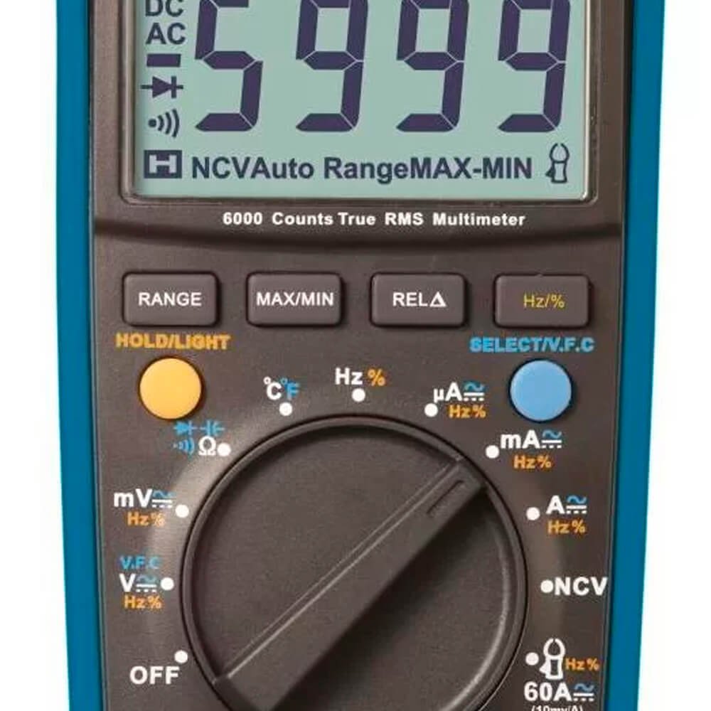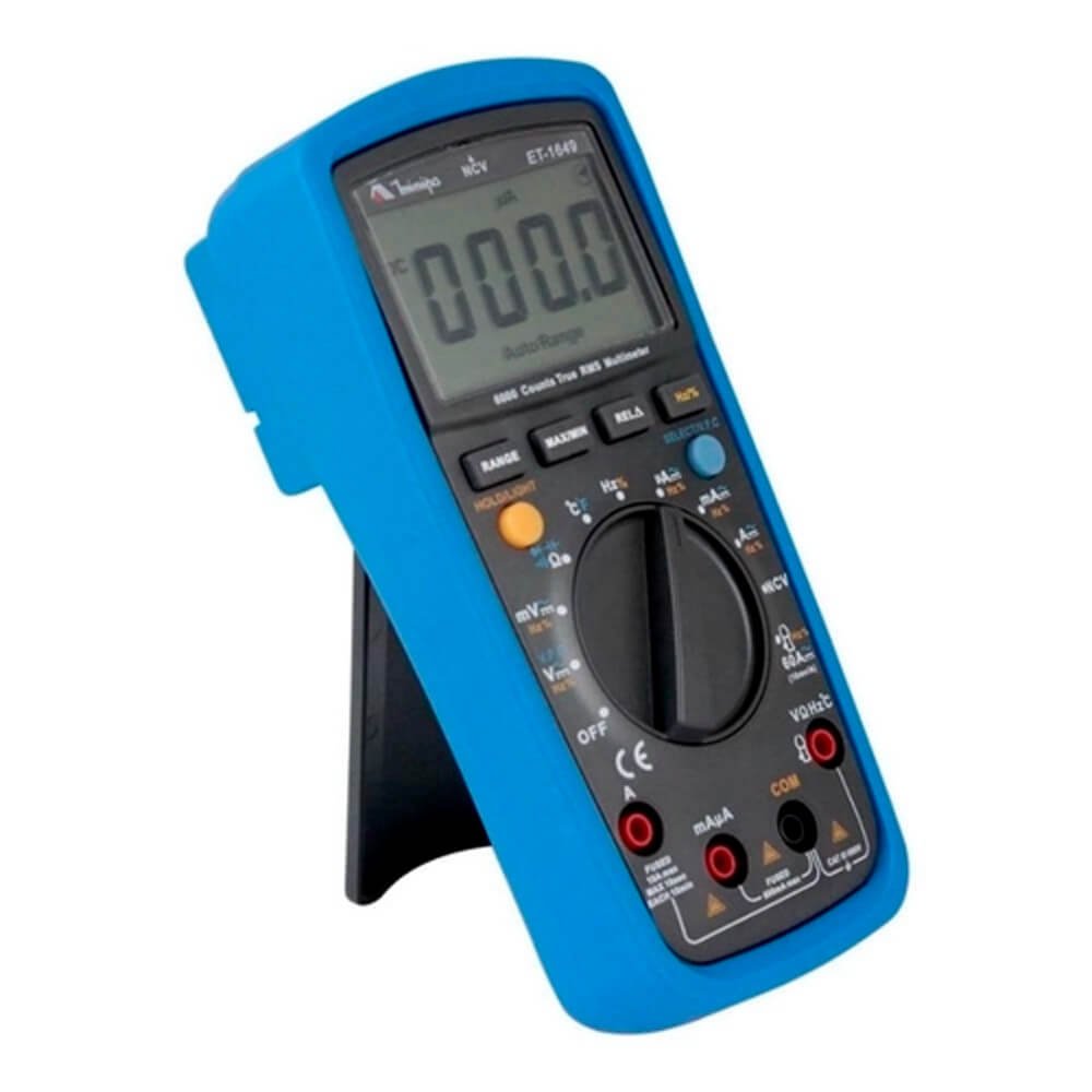 Aplicações: Diferencia-se por ser pequeno, portátil, True RMS, auto range e possuir display de 3 5 / 6 dígitos com uma estrutura original, altamente confiável e segura, assim como um display grande. O instrumento pode ser usado em medidas de tensão AC/DC, corrente AC/DC, tensão com frequência variável (VFC), resistência, diodo, continuidade, capacitância, temperatura, frequência e NCV (tensão AC sem contato). É o instrumento portátil ideal para manutenção.