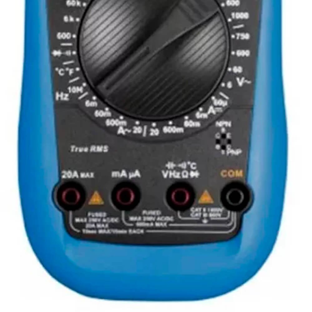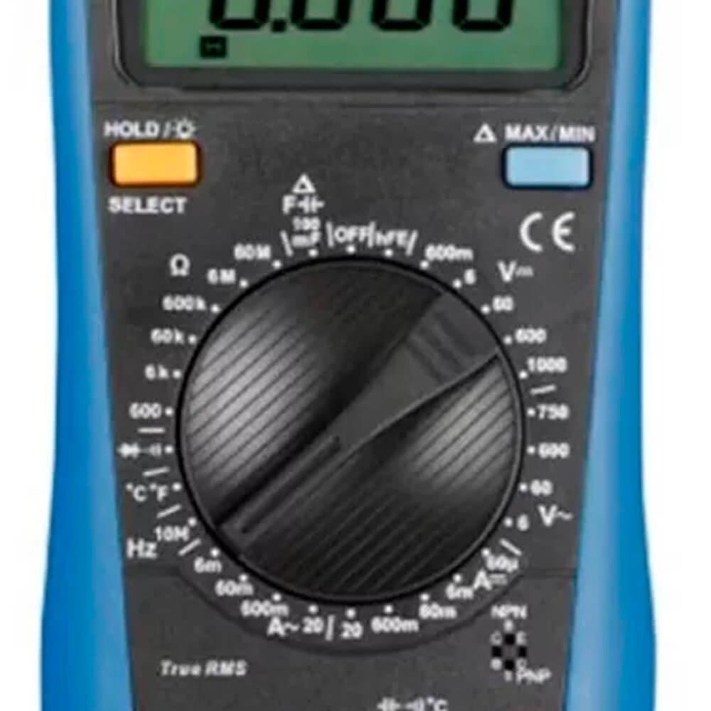 Aplicações: Instrumento TRUE RMS projetado para profissionais que necessitam de uma ampla gama de funções podendo ser usado em laboratórios e ambientes de média potência desde que esteja de acordo com a sua categoria de segurança. Realiza medidas de tensão e corrente DC/AC, resistência, capacitância, frequência, temperatura, testes de diodo e continuidade e modo data hold.