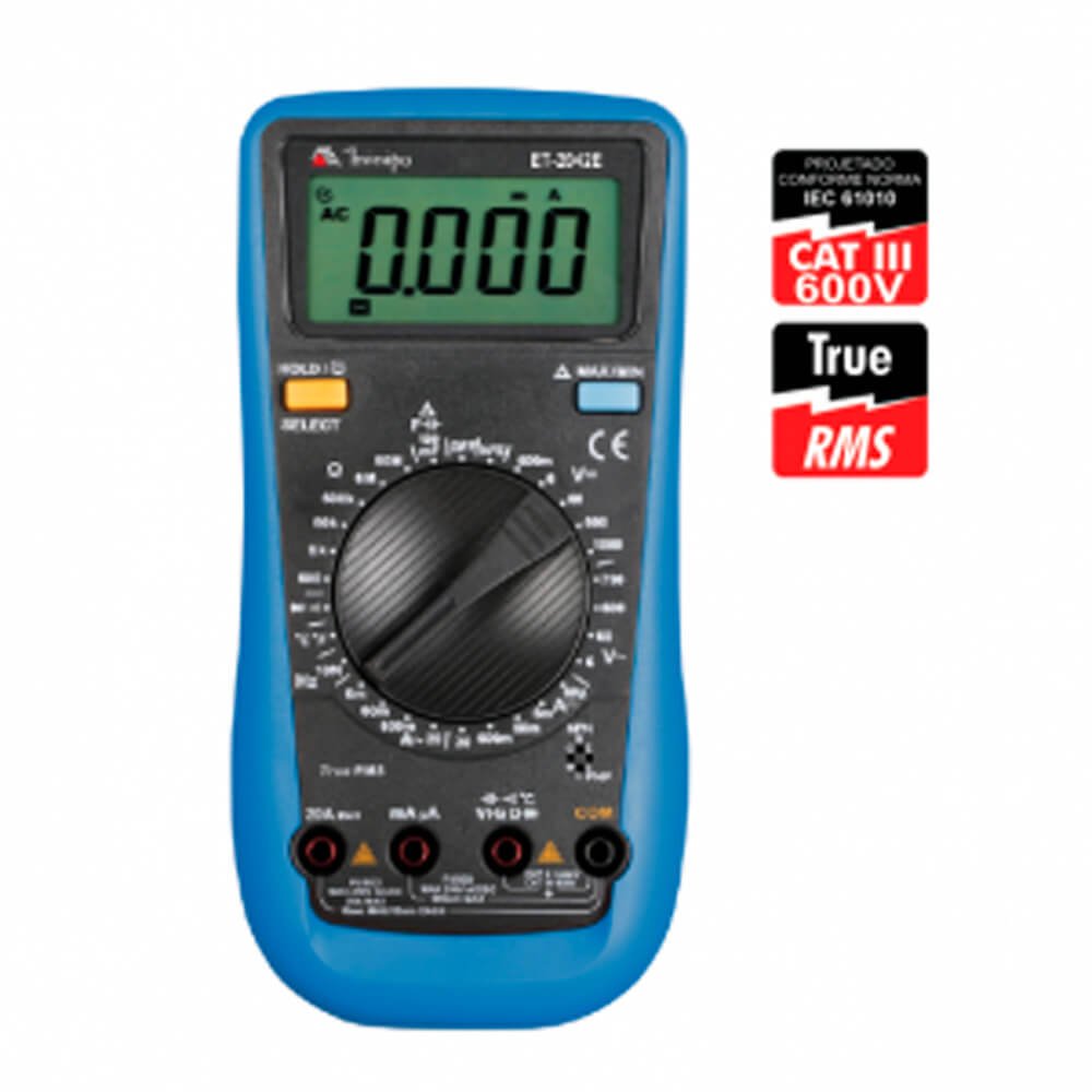 Segurança: Este instrumento está de acordo com a norma IEC/ EN 61010-1, Categoria III 600V e possui certificação CE. Como determinado pela norma de segurança NR-10, utilize sempre equipamentos de proteção individual.