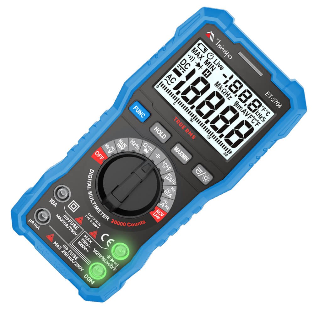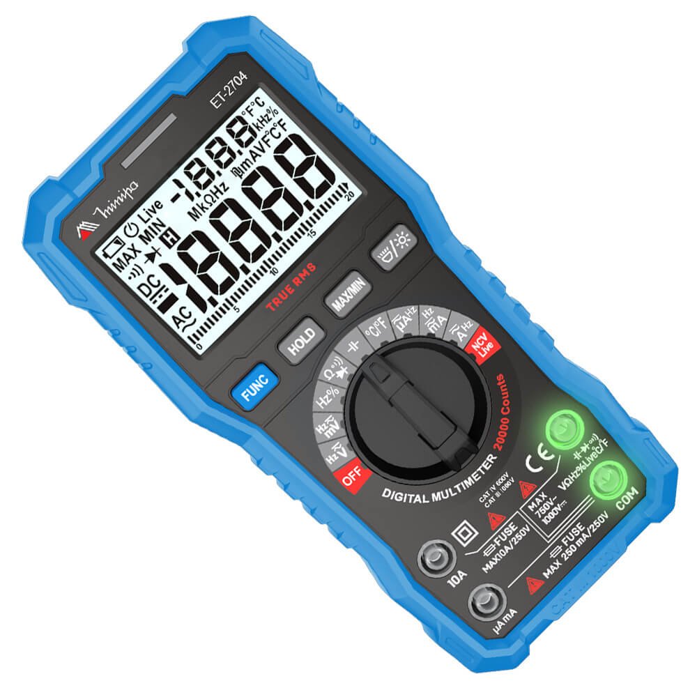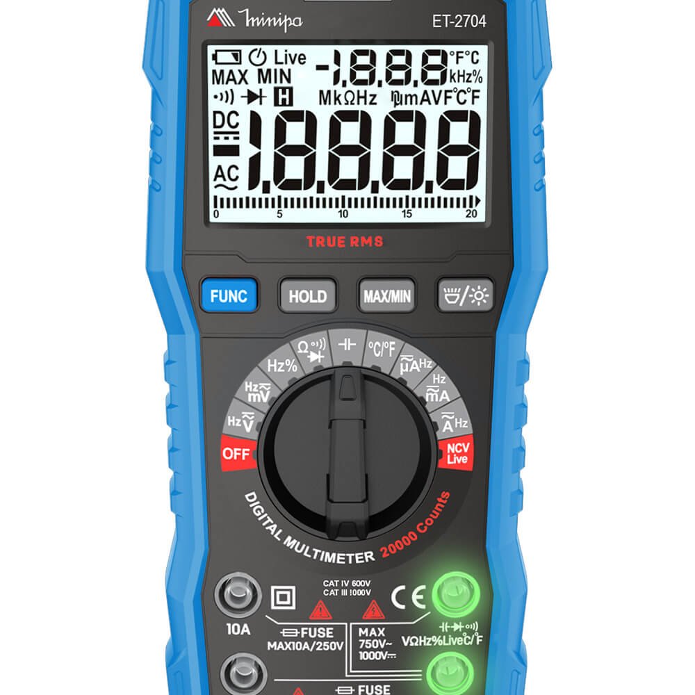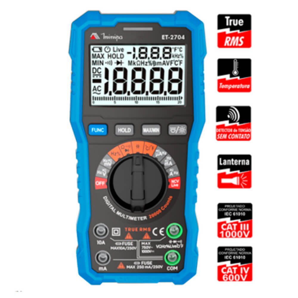 O multímetro digital ET-2704 é uma ferramenta versátil e confiável para medições elétricas e eletrônicas. Com display LCD de 4 1/2 dígitos e 20000 contagens, possui True RMS, indicador de linha viva, NCV, teste de continuidade/diodo e muito mais. Com categoria de segurança CAT III 1000V / CAT IV 600V, é ideal para profissionais que trabalham com eletricidade em ambientes industriais e residenciais. Com precisão básica de ±0,08% + 5D e diversas funções avançadas, o ET-2704 é uma escolha confiável para aplicações exigentes.