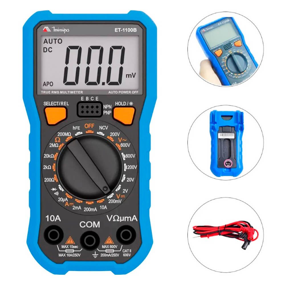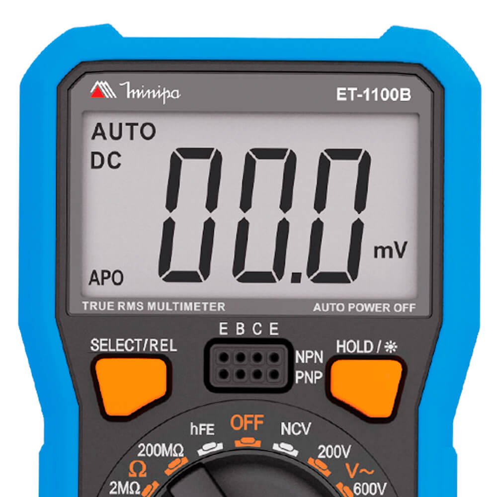 O modelo ET-1100B é um multímetro compacto, prático e de fácil manuseio. Ele faz medições de corrente DC, tensões AC/DC, resistência, teste de diodo, continuidade e hFE. Além das funções de desligamento automático, data HOLD e NCV.