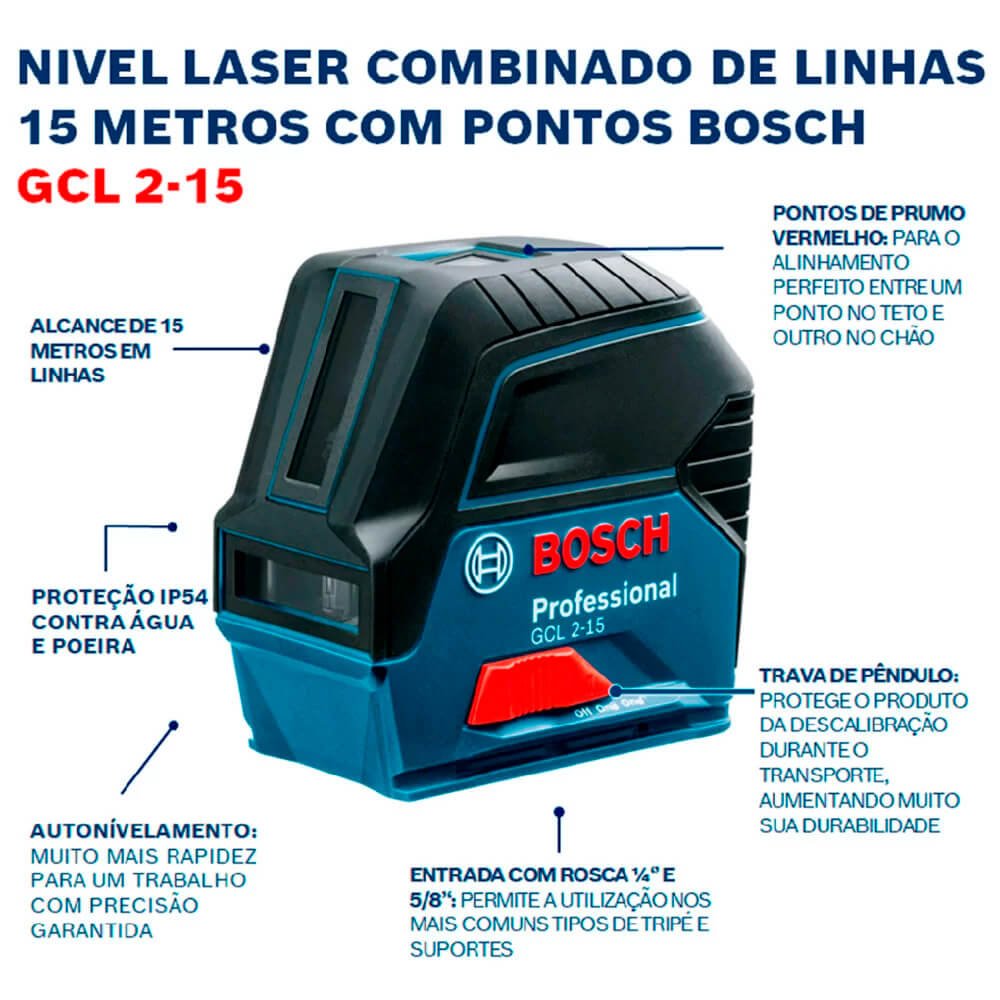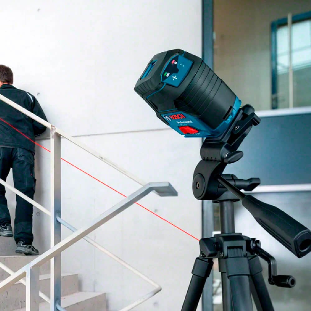 Nível a laser desenvolvido com alta tecnologia e material de alta qualidade. Design compacto e versátil ideal para nivelamento de curta distância. Suas linhas laser horizontais e verticais e dois pontos de prumo centrados possibilita a visibilidade ideal e livremente selecionável. Podendo ser posicionadas ao redor dos pontos de prumos centrados. Possui aplicação flexível com suporte multi-funções rotativo RM 1 Professional para alinhar as linhas laser e para uma montagem versátil da ferramenta. A imobilização pendular assegura a segurança no transporte. De fácil manuseio devido à operação com uma só mão e interface de usuário intuitiva. Com suto nivelamento horizontal e vertical até mais ou menos 4°.