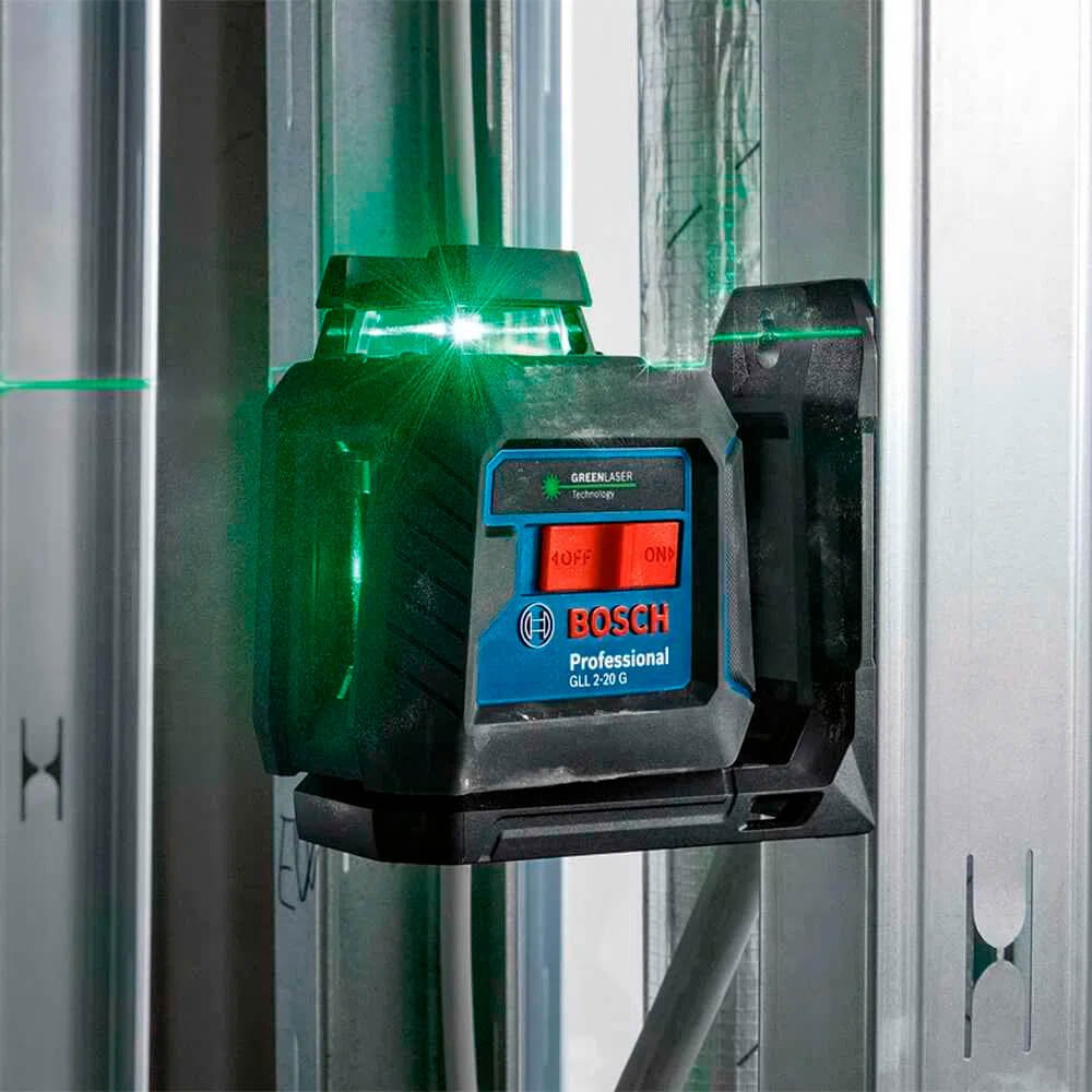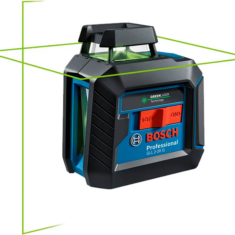 O GLL 2-20 G Professional é um robusto nível laser de linhas fácil de usar e projeta tanto uma linha vertical como uma linha horizontal em 360°. Estas linhas verdes são altamente visíveis. Construído para lidar com condições difíceis, o nível laser de linhas vem em uma caixa robusta com revestimento de borracha com vidro embutido em conformidade com os padrões IP64 de proteção contra poeira e respingos de água. Operação intuitiva através do interruptor de ligar/desligar e um teclado de um botão para seleção fácil da configuração horizontal, vertical ou cruzada.