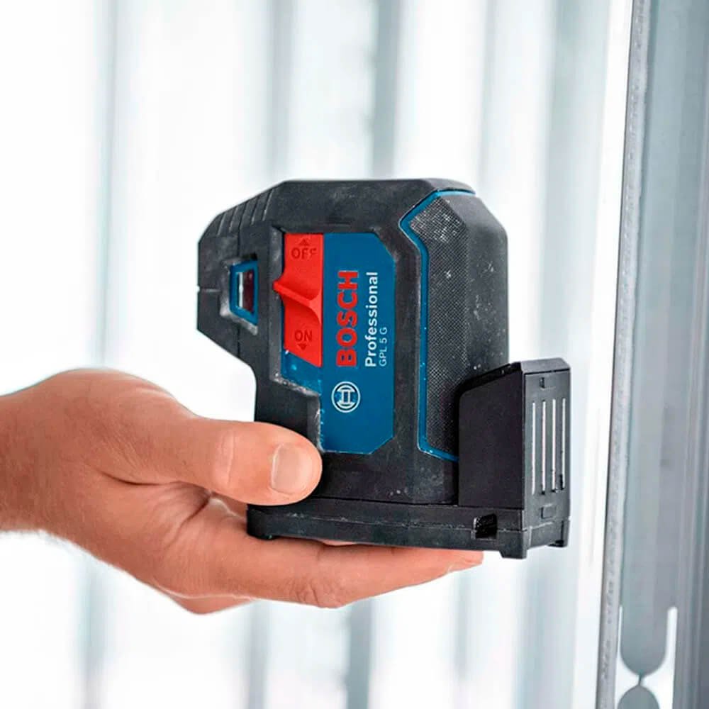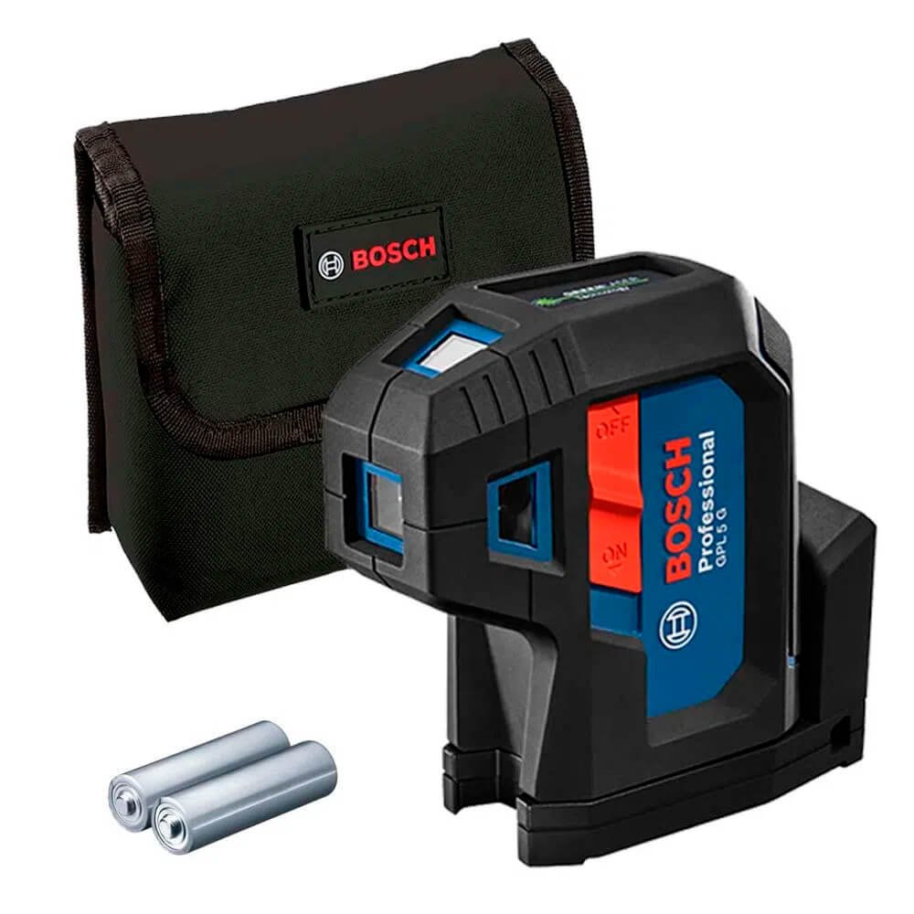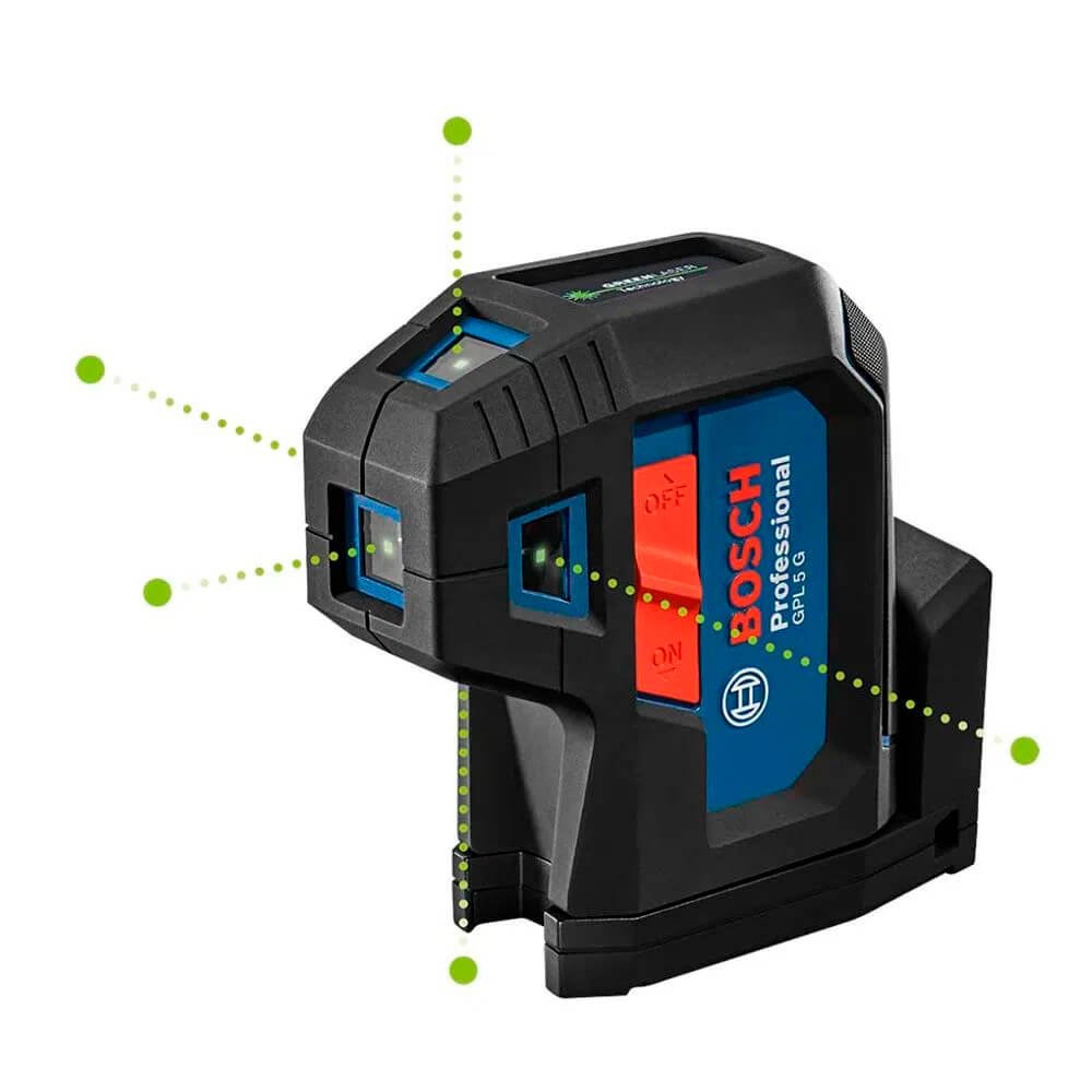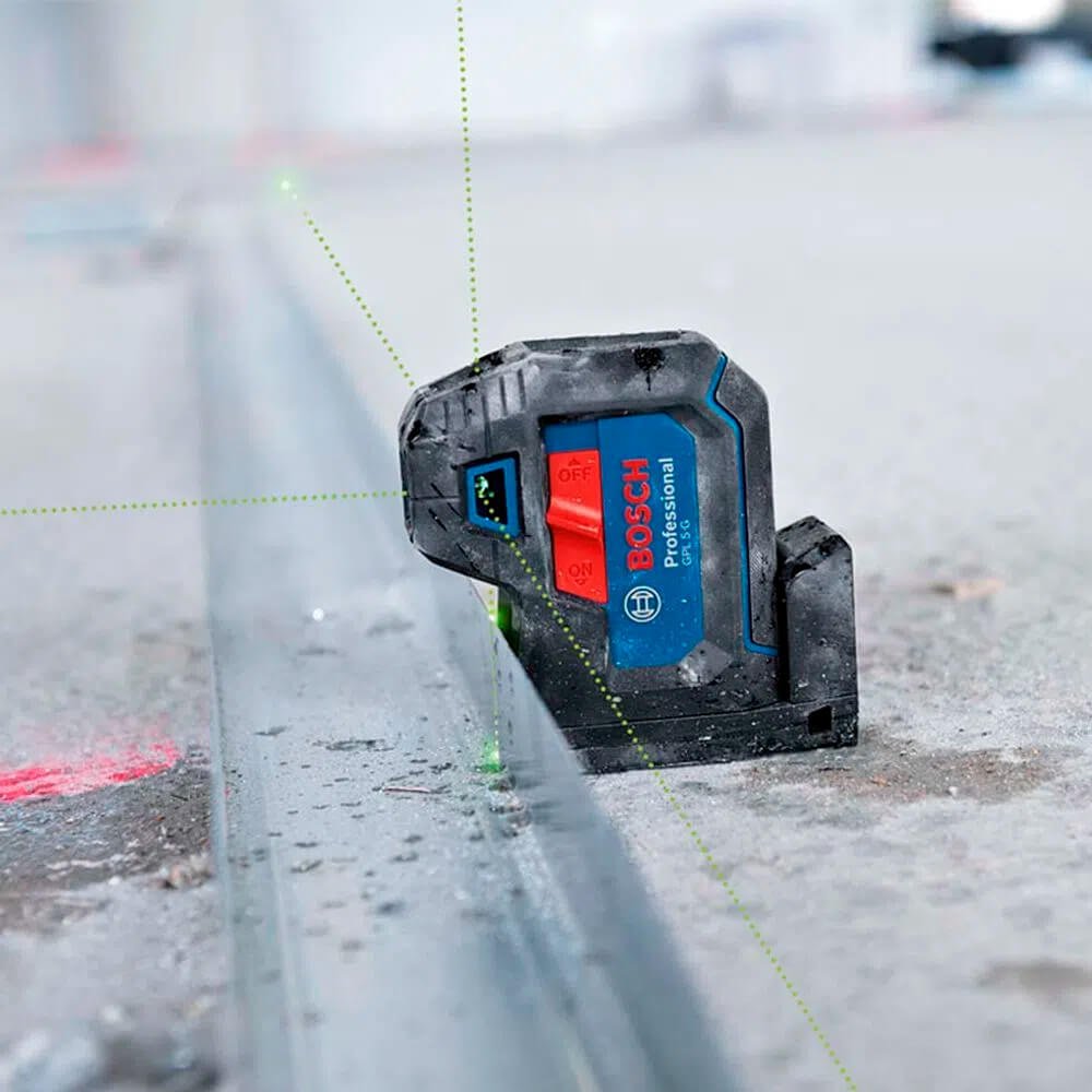 O Nível de Laser Verde Bosch GPL 5 G foi feito para alinhar dois pontos entre si perfeitamente e marcar ângulos de 90º em qualquer direção. Com o Nível Laser de pontos Bosch GPL 5 G voce terá várias opções de alinhamento de pontos, checagem de prumo, pontos de prumo permitindo alinhamento perfeitamente perpendicular entre o teto e o chão, referência de 90° para enquadrar cantos e superfícies, nívelação vertical permitindo instalações perfeitamente aprumadas nas paredes, alinhamento horizontal a partir dos pontos projetados nas laterais do aparelho, esquadro horizontal entre o ponto frontal e lateral para guiar instalações e transferências de pontos na horizontal para instalações precisas. O Nível de Laser Verde Bosch GPL 5 G tem até 5 pontos de referência simultâneos para divisórias perfeitamente alinhadas entre ambientes e encaixe de 1/4" permitindo a utilização nos mais comuns tipos de tripé e suportes.