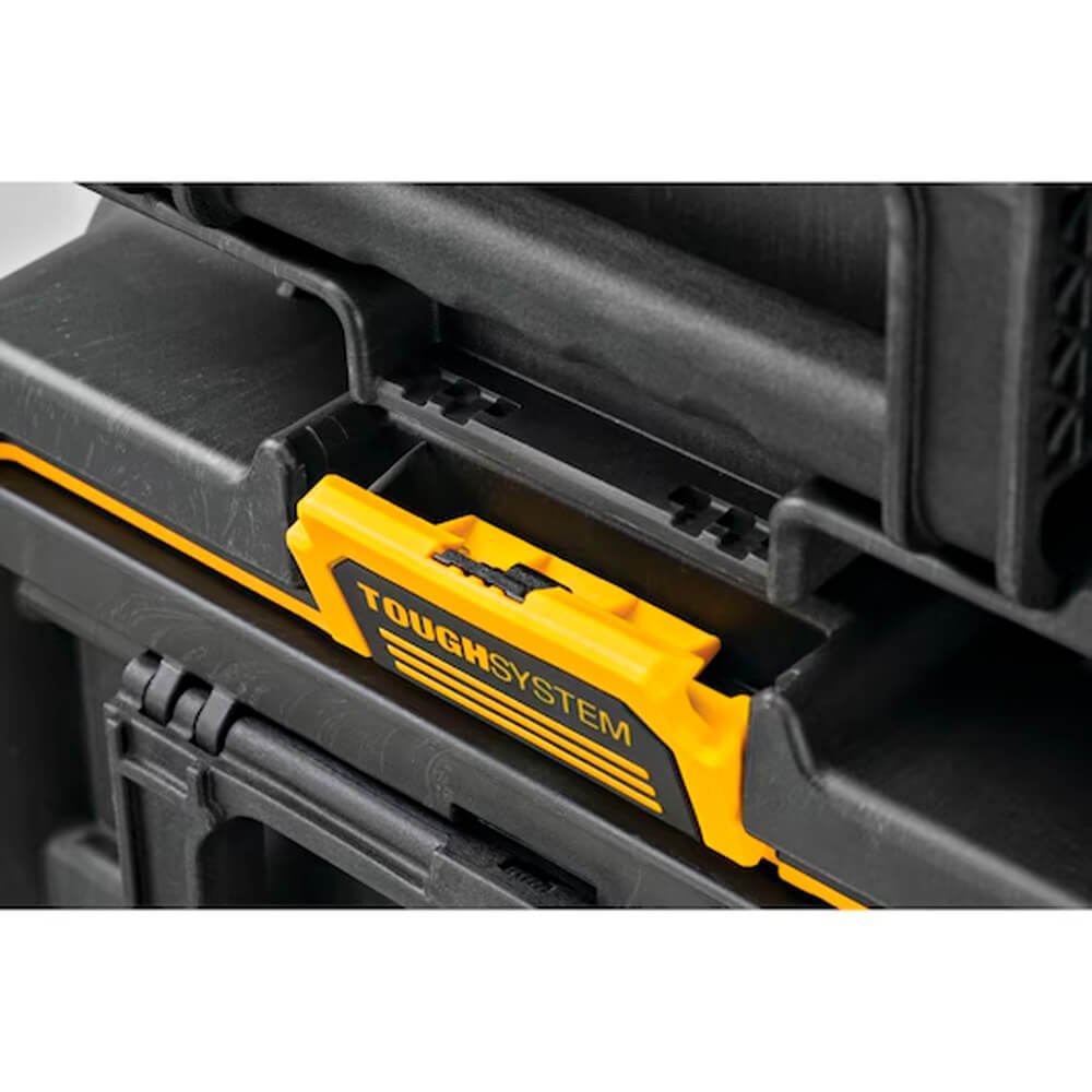 Organizador extra grande 55x37x41 ToughSystem® 2.0 tem travas laterais de conexão automática patenteadas, permitindo a operação com uma só mão. Também possui travas frontais de metal de duas peças para maior durabilidade ao prender as ferramentas dentro da caixa. Sua classificação é IP65 para resistência à poeira e à água e tem capacidade de carga de 49,90kg. A caixa de ferramentas tem uma bandeja interna removível para otimizar a organização. A caixa de ferramentas extragrande ToughSystem® 2.0 é compatível com qualquer produto ToughSystem®.