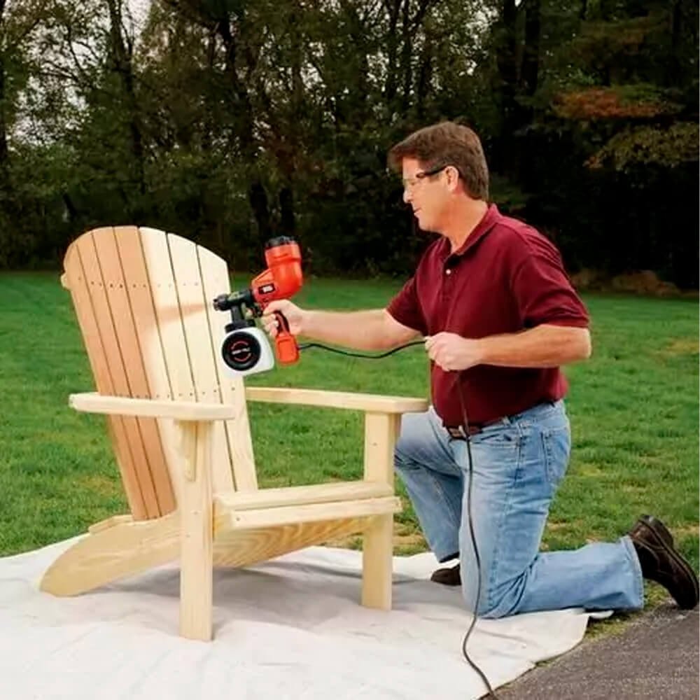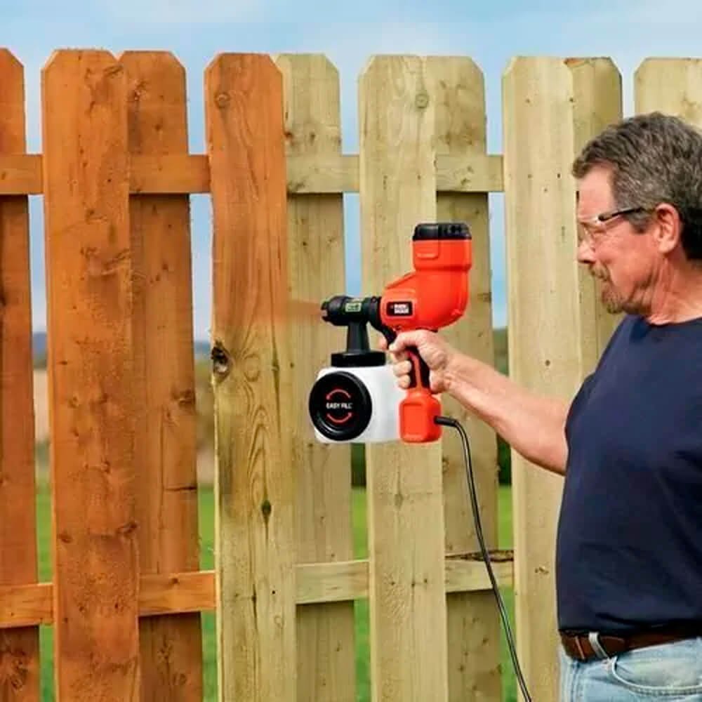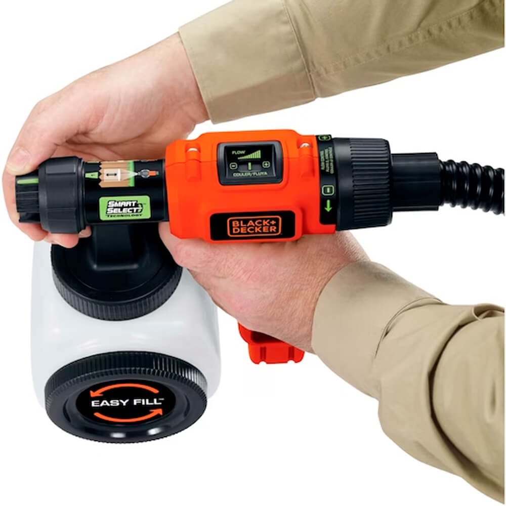 Pistola para pintura e pulverização dotado de um sistema SMART SELECT que regula os 3 níveis de pulverização horizontal, vertical e circular, 278W de potência, com fluxo máximo de 800ml/min, com controle de fluxo de tinta no gatilho, com EASY FILL contendo uma tampa secundária para um recarregamento rápido, com capacidade do reservatório de 1,1l, completo com seus acessórios indispensáveis ao funcionamento como pistola, recipiente de enchimento lateral, balde auxiliar para despejo e diluição, vaso de viscosidade e escova de limpeza.