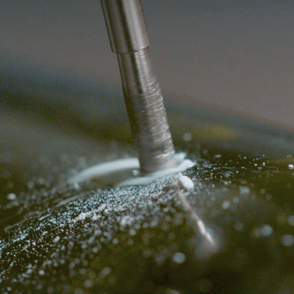 Em seguida eleve gradualmente a ferramenta para fazer um furo a 90 graus. Aplique gotas de água/líquido de refrigeração na peça de trabalho para uma operação de perfuração perfeita. Você pode retirar o acessório do material para aplicar água ou líquido de refrigeração.