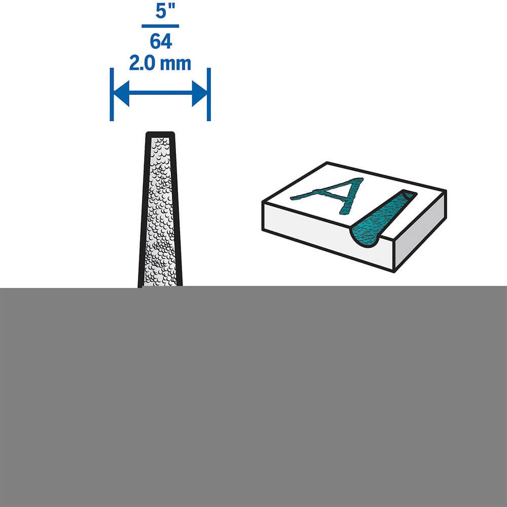 Ponta coberta com partículas de diamante para trabalho com materiais duros, como cerâmica, aço temperado, vidro, pedras semipreciosas, madeiras e outros. Removem material facilmente em trabalhos detalhados como cortar, gravar, entalhar, esculpir, retocar ou dar acabamento. Use altas velocidades para madeiras duras, mais baixas para metais e muito baixas para plásticos.