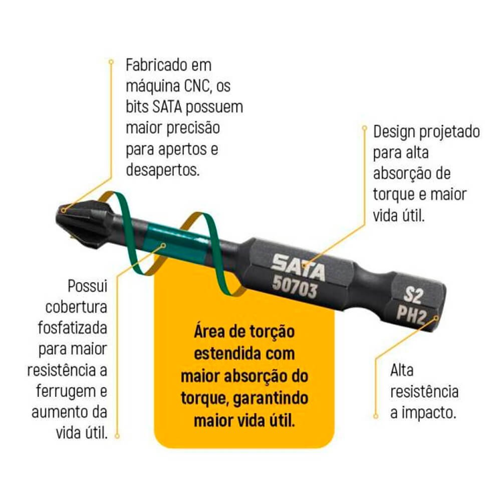 - Os bits SATA foram projetados com área de torção estendida, que reduz níveis de quebra devido a alta absorção de impacto, aumentando a durabilidade e vida útil do produto