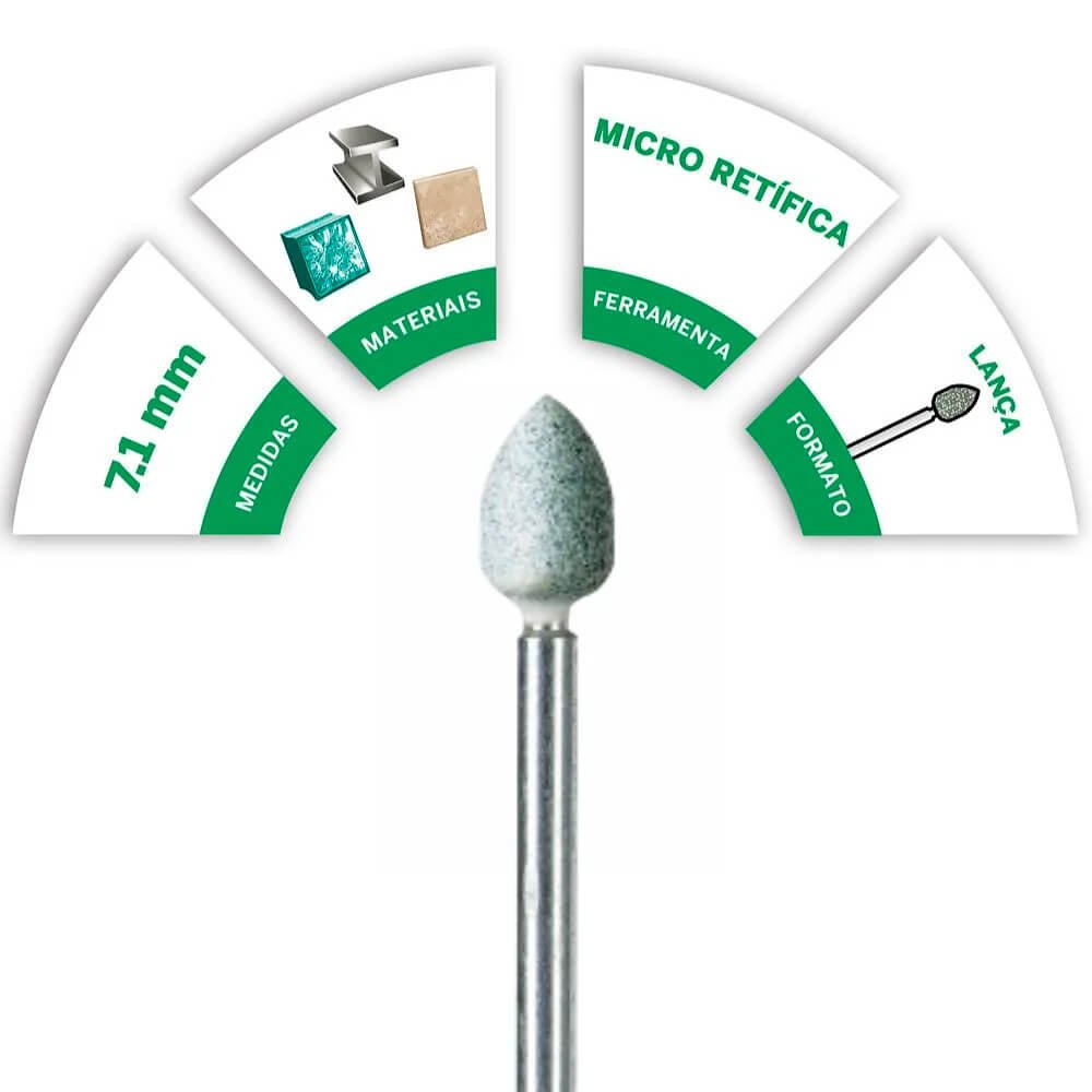 Ponta montada para esmerilhar e gravar em materiais como pedra, vidro, cerâmica, porcelana e metais não-ferrosos. Ideal para dar forma, remover rebarbas e polir materiais duros. Especialmente projetado para trabalho em superfícies planas e cônicas. Perfeito para desbastes e gravuras.