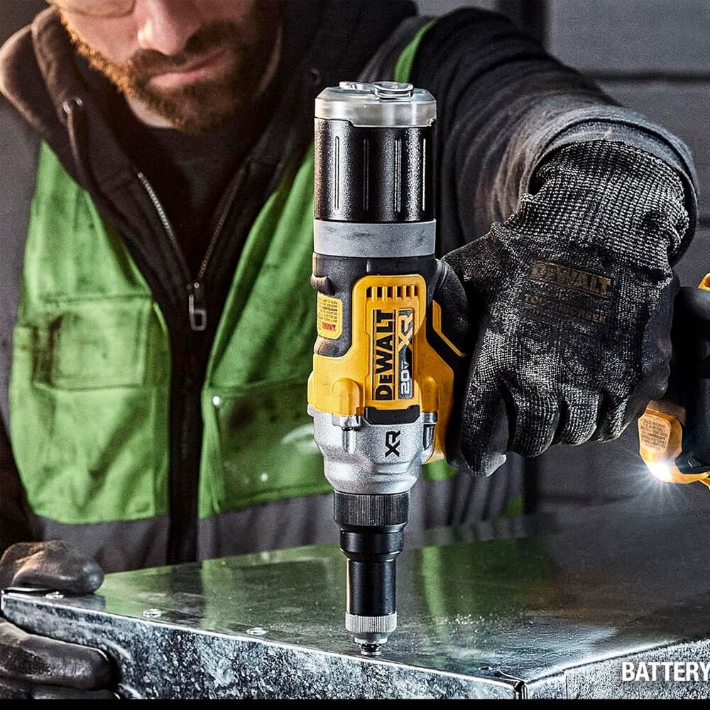 A ferramenta de rebite sem fio de 1/4" sem escova 20V MAX* XR é leve, mas potente, com um motor sem escova que fornece até 4.500 lbf de força de tração (usando bateria DCBP034, vendida separadamente) para fixar rebites cegos de alumínio, aço e aço inoxidável para 1/4".