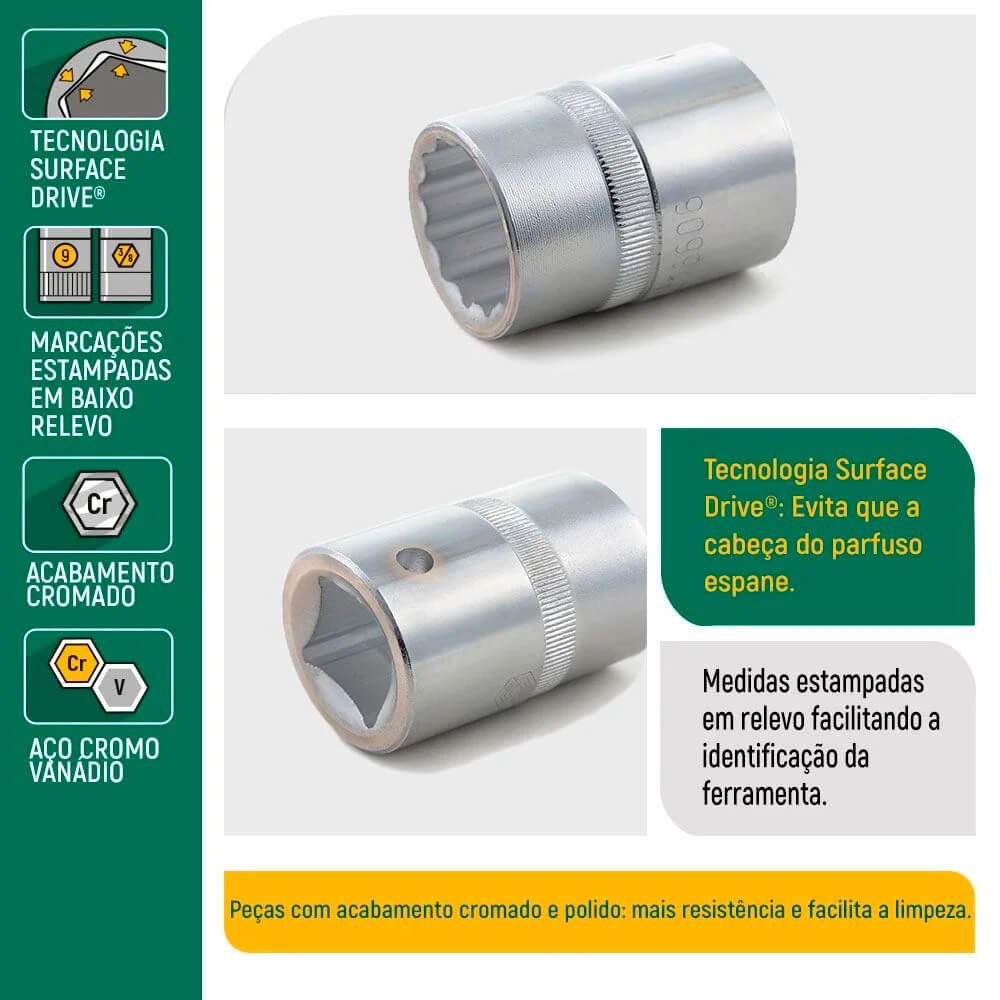Fabricado em Aço Cromo-Vanádio (Cr-V) para maior resistência e durabilidade Exclusiva tecnologia Surface Drive®: trabalha na superfície plana de parafusos sextavados e estriados, garantindo maior distribuição de força no corpo do soquete e no parafuso.