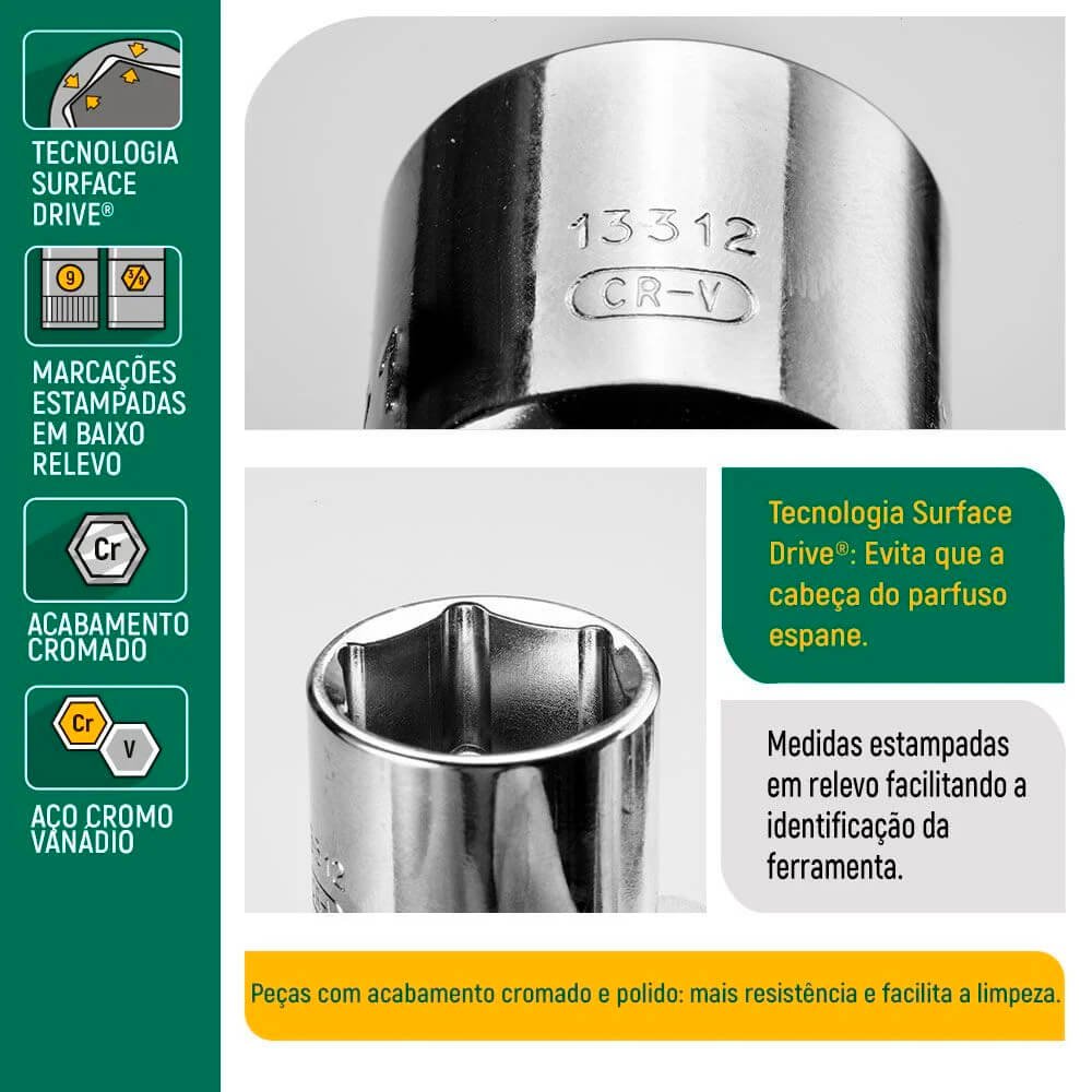 Fabricado em Aço Cromo-Vanádio (Cr-V) para maior resistência e durabilidade Exclusiva tecnologia Surface Drive®: trabalha na superfície plana de parafusos sextavados e estriados, garantindo maior distribuição de força no corpo do soquete e no parafuso.
