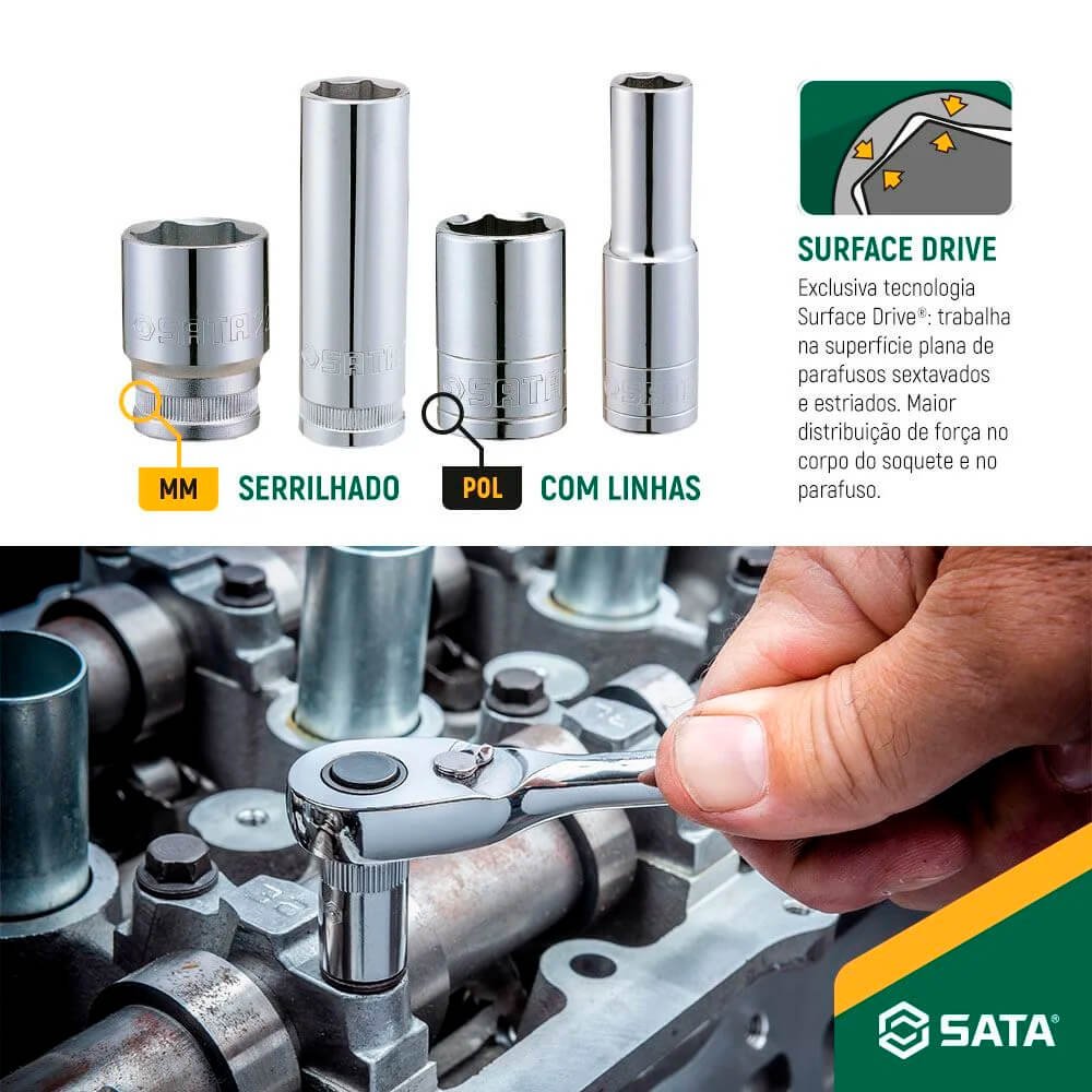 Soquete Sextavado Longo com encaixe de utilizado para afrouxar e apertar parafusos e porcas em conjunto de outros acessórios manuais. Fabricado em Aço Cromo-Vanádio(Cr-V) para maior resistência e durabilidade com acabamento cromado polido para mais segurança. Possui área interna em perfil arredondado, o que melhora a distribuição de torque e deixa o soquete mais resistente. A espessura da parede dos soquetes foi dimensionada para beneficiar trabalhos em locais de difícil acesso. São identificados pelo encaixe quadrado, e pela boca de perfis sextavados. Atende às normas ASME B107.5M e B107.1