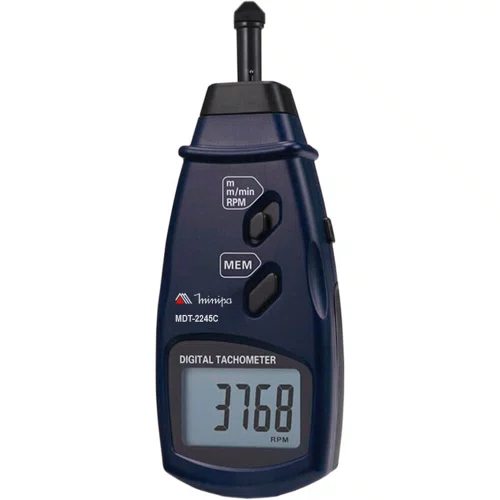 O modelo MDT-2245C é um Tacômetro de Contato para medidas de RPM, m/min. e metros, compacto, com display de 5 dígitos e fácil de usar. Composto por microprocessador dedicado com base de tempo a cristal, fornecendo medidas de alta precisão e alta taxa de amostragem. Utiliza componentes de vida longa com gabinete plástico leve e resistente, proporcionando excelente performance, não necessitando de manutenção por vários anos. Apresenta uma ampla faixa de medida de 0,5 a 20000 RPM e função de armazenamento automático dos valores máximo e mínimo, além do último valor medido, através da tecla “MEM”.