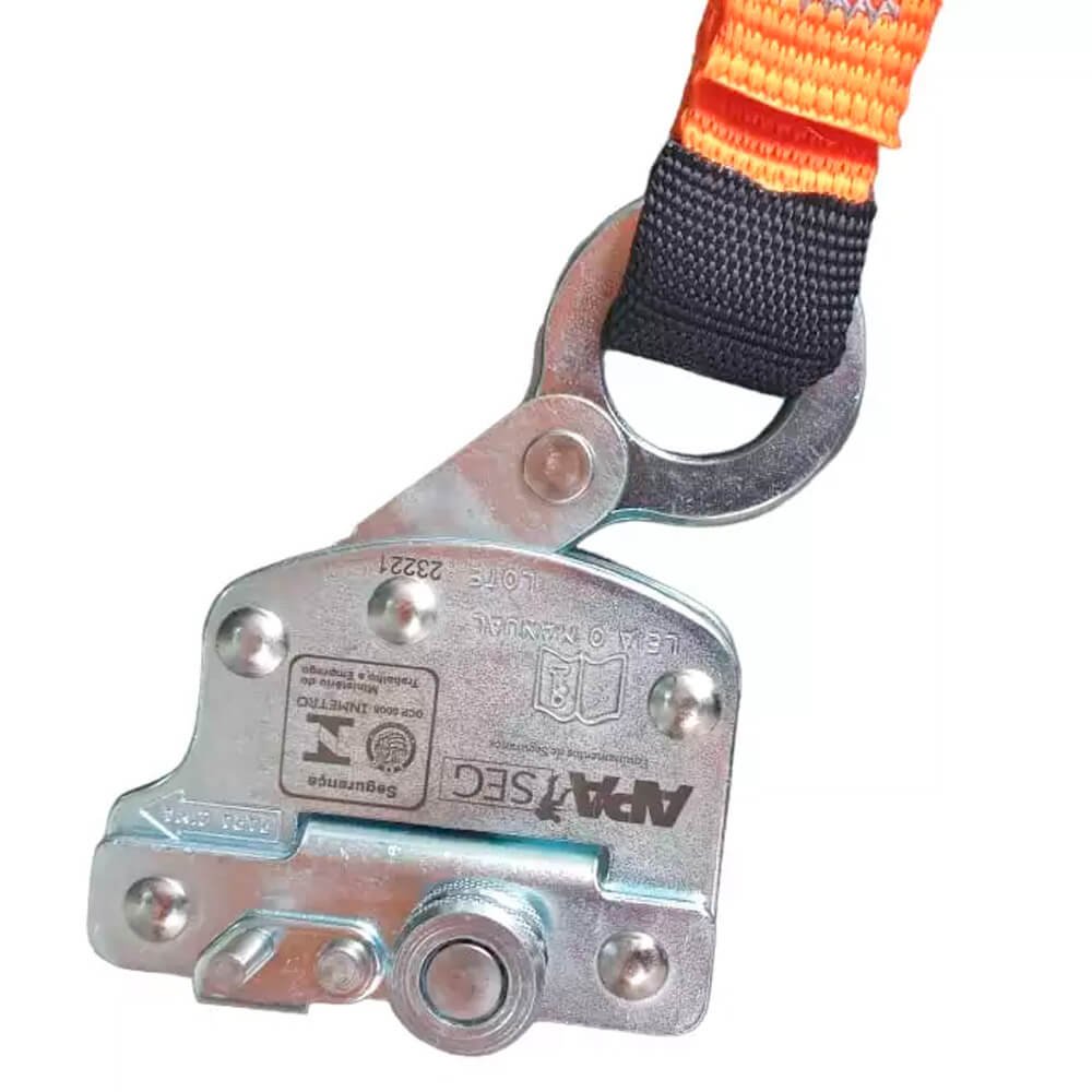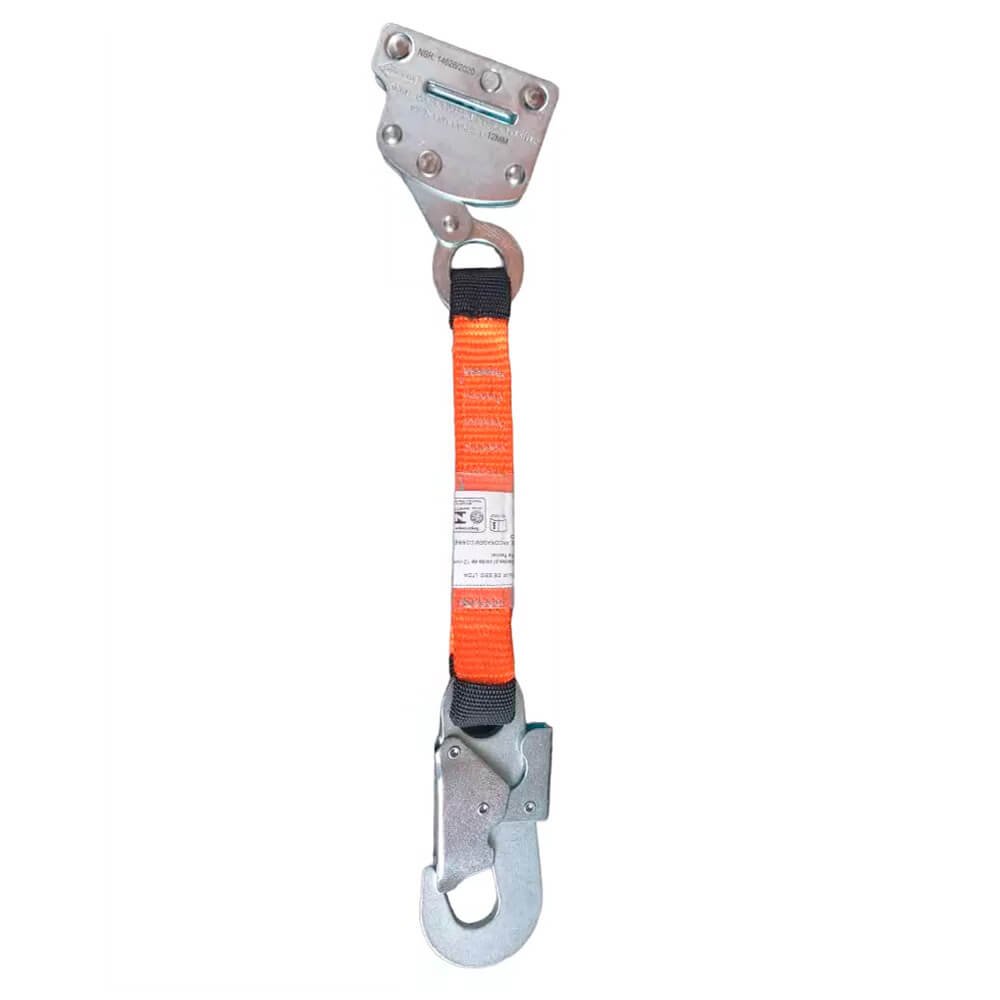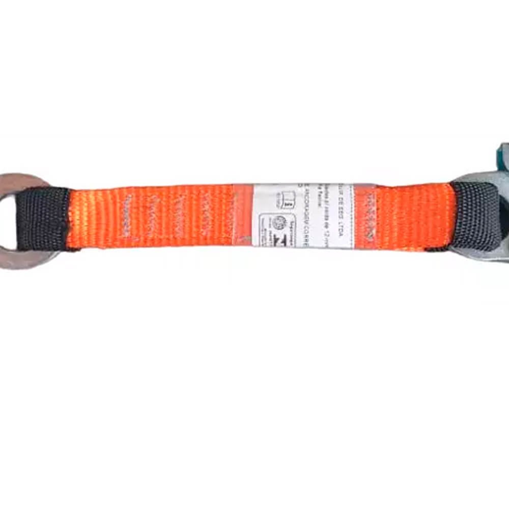 Dispositivo Trava Quedas com extensor de 200 mm confeccionado em fita de poliéster de 25 mm, com costuras reforçadas, possui dupla trava para maior segurança, mosquetão oval classe B de 20 mm de abertura;
