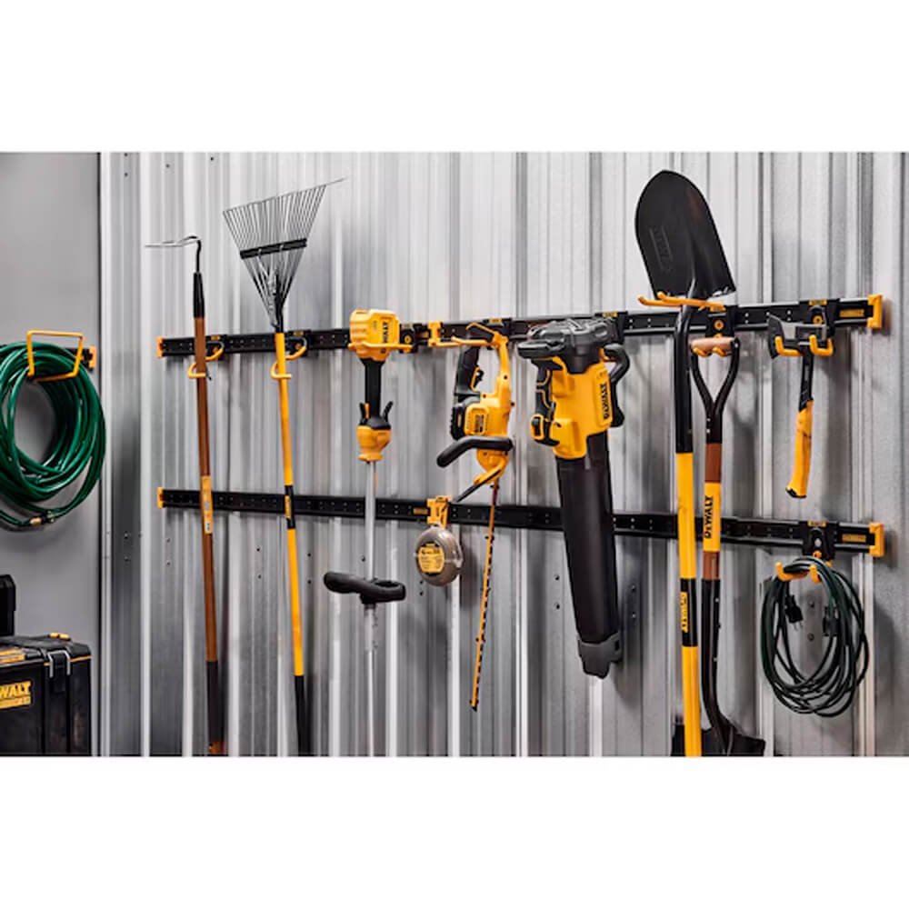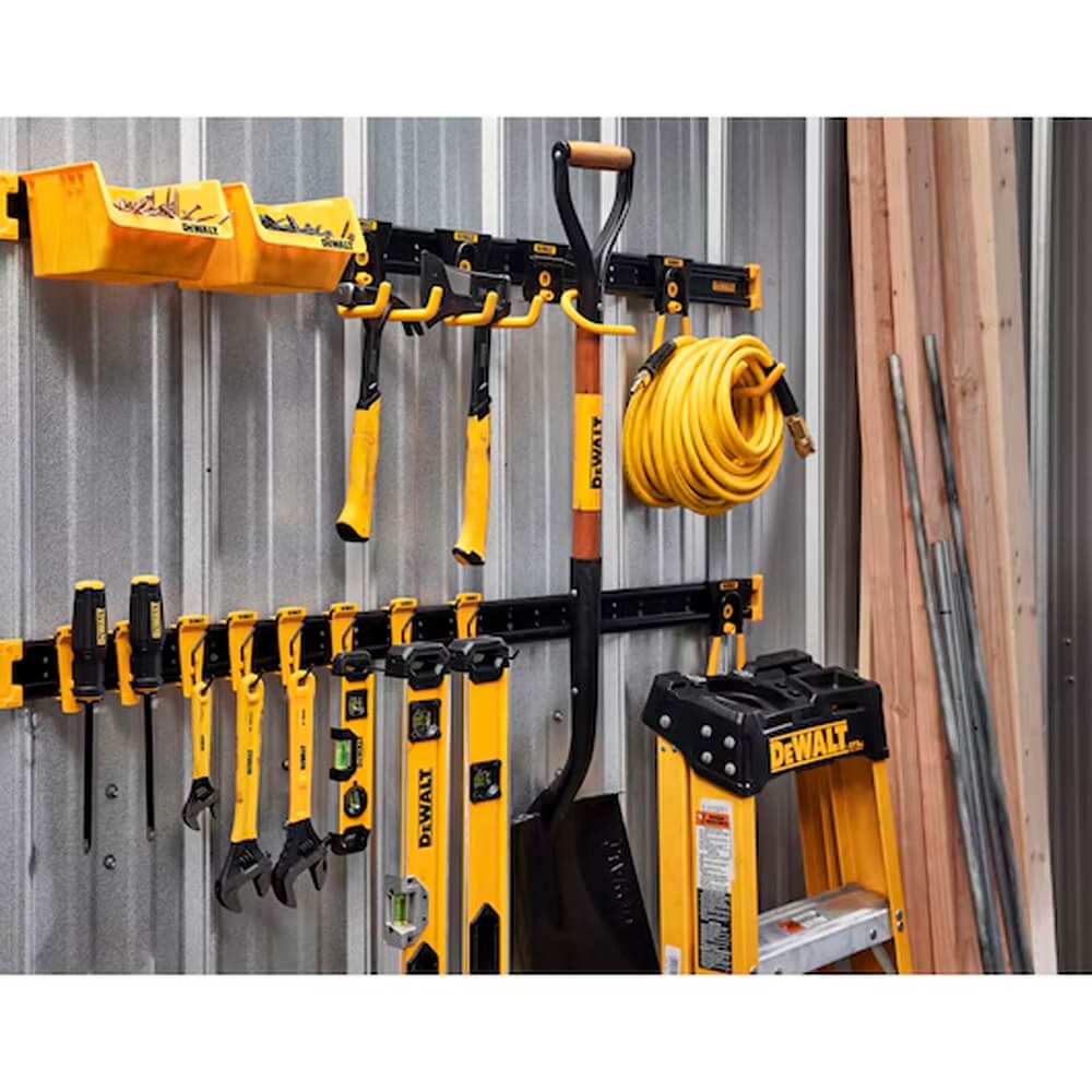 TRILHO DE METAL DEWALT de 48 pol. (121cm), feito em aço resistente, suporta até 45 kg por metro linear. Permite conexão de vários trilhos, instalação de acessórios e vem com fixadores para montagem na parede. Ideal para organizar e integrar o armazenamento na oficina. O conjunto de ganchos para ferramentas manuais DEWALT 8pc faz parte do sistema de armazenamento para oficinas DEWALT e é montado diretamente no trilho de metal DEWALT. Ele inclui três tipos diferentes de ganchos para ajudar a armazenar uma variedade de ferramentas manuais e acessórios.