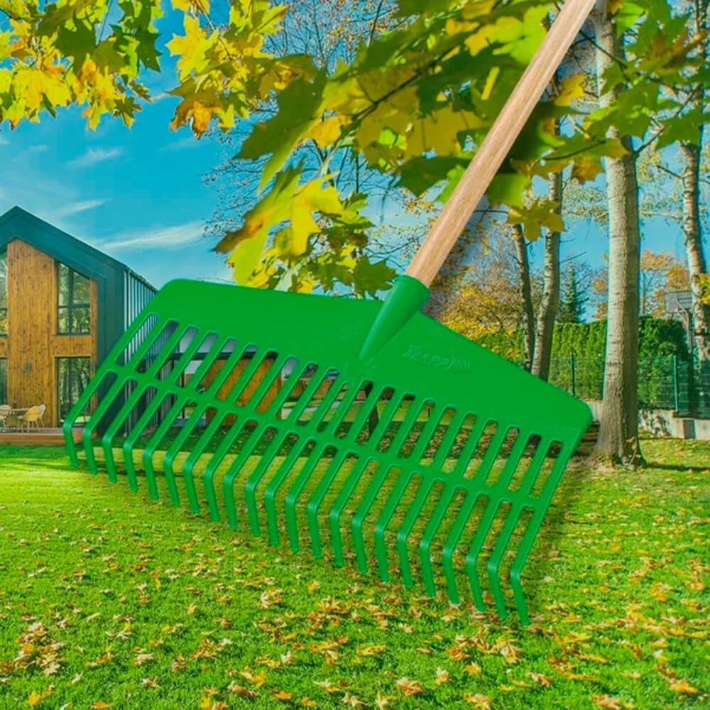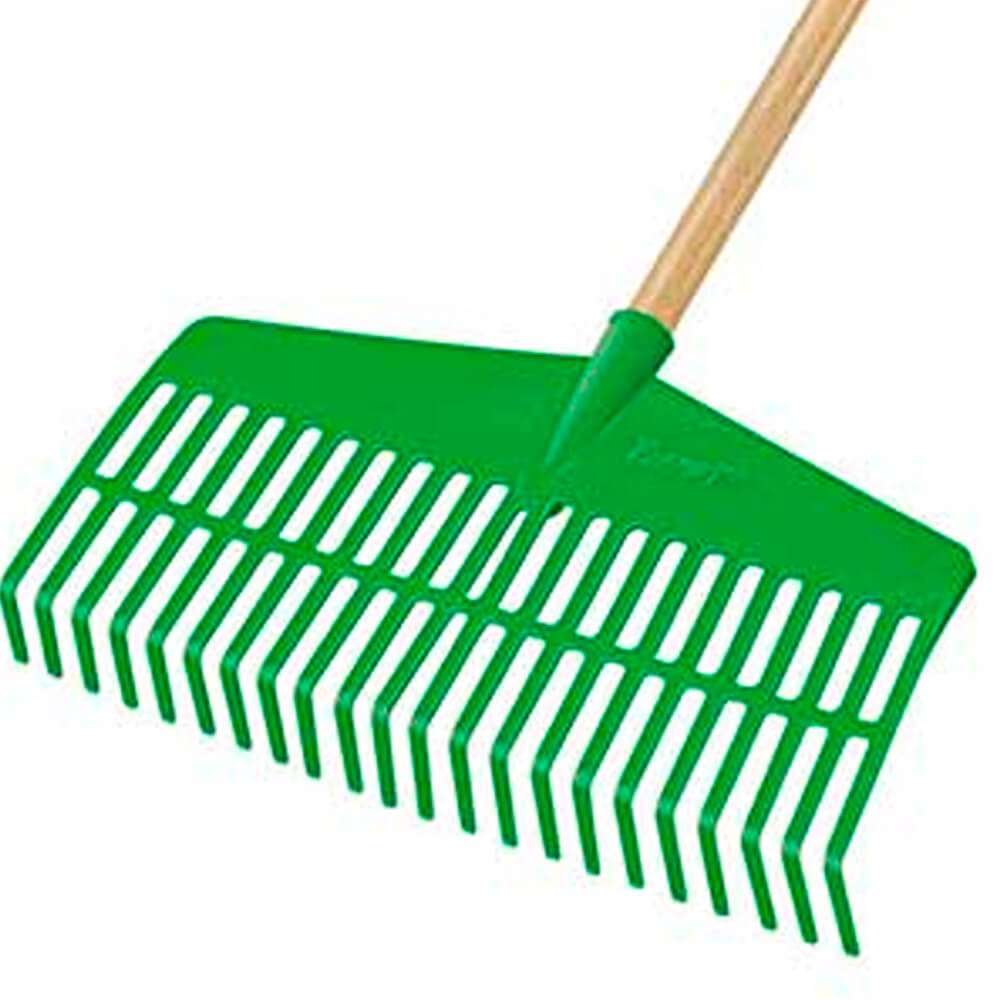 A Vassoura tipo ancinho em plástico com cabo FJ-1026 da Trapp é indicada para varrer e recolher grama e folhas, com amplo ângulo de atuação.